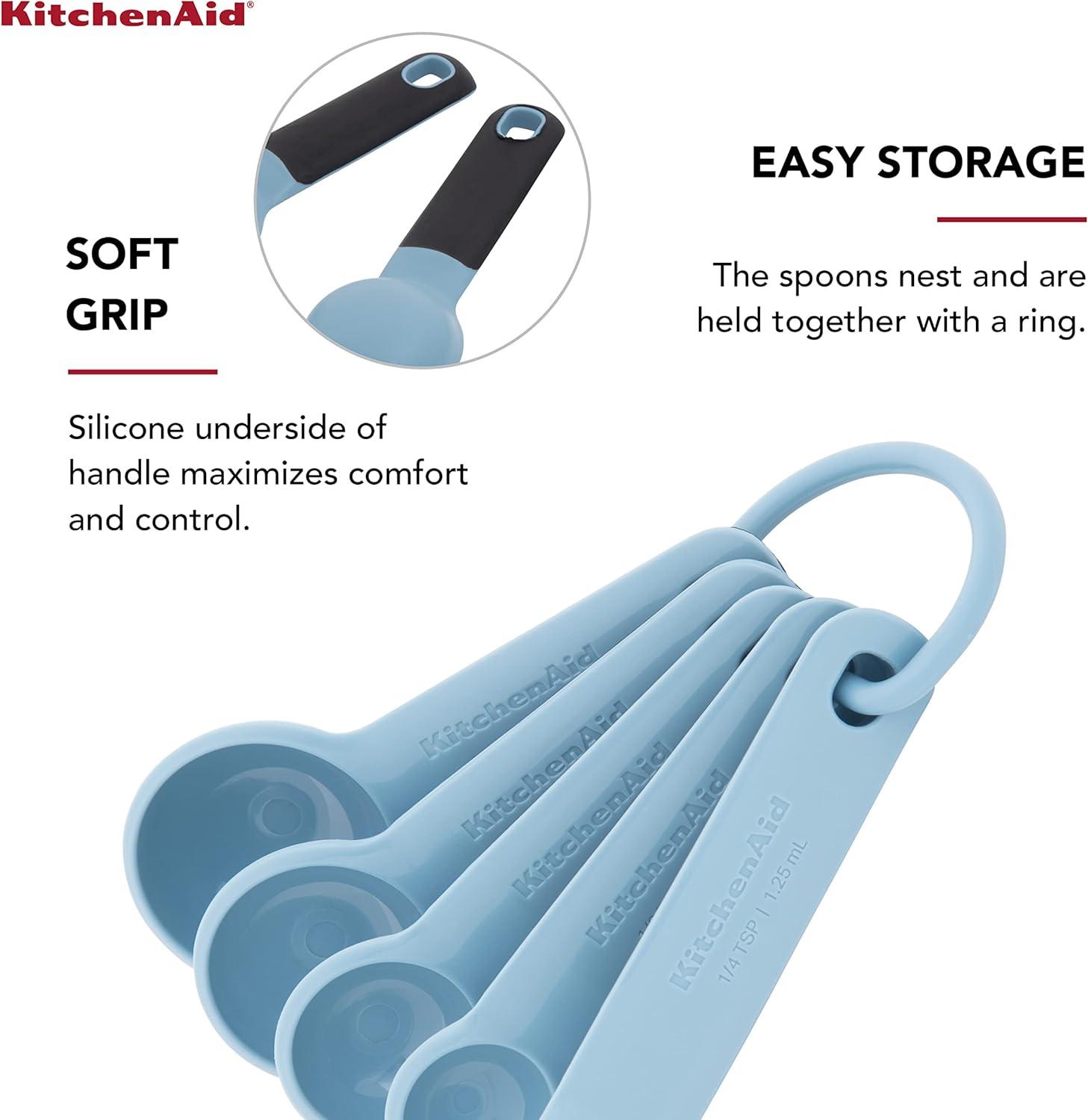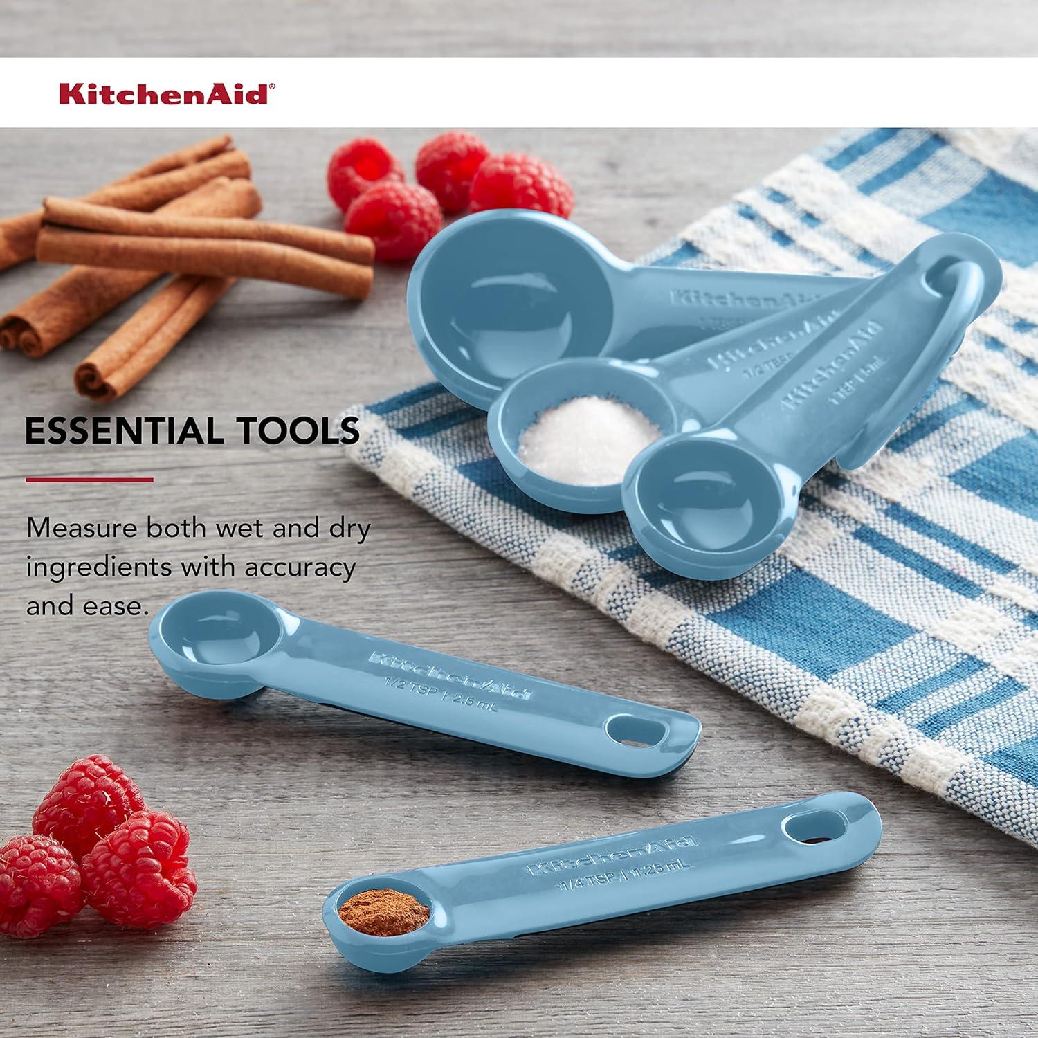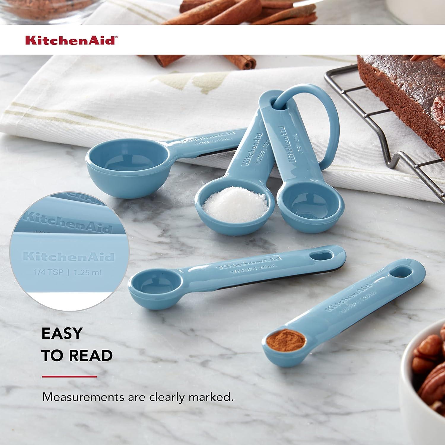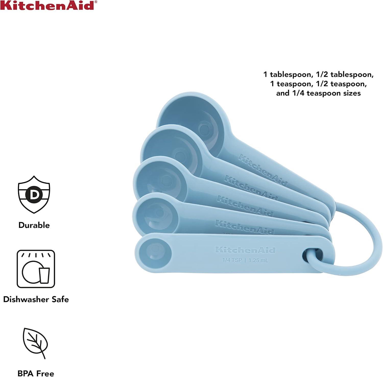 This KitchenAid 5-Piece Measuring Set includes essential tools you need to measure both wet and dry ingredients. The measurements are cleary marked and easy to read and a ring keeps the spoons together for easy storage. The set includes: 1 tablespoon (15mL), 1/2 tablespoon (7.4mL), 1 teaspoon (5mL), 1/2 teaspoon (2.5mL) and 1/4 teaspoon (1.25mL). Dishwasher Safe
