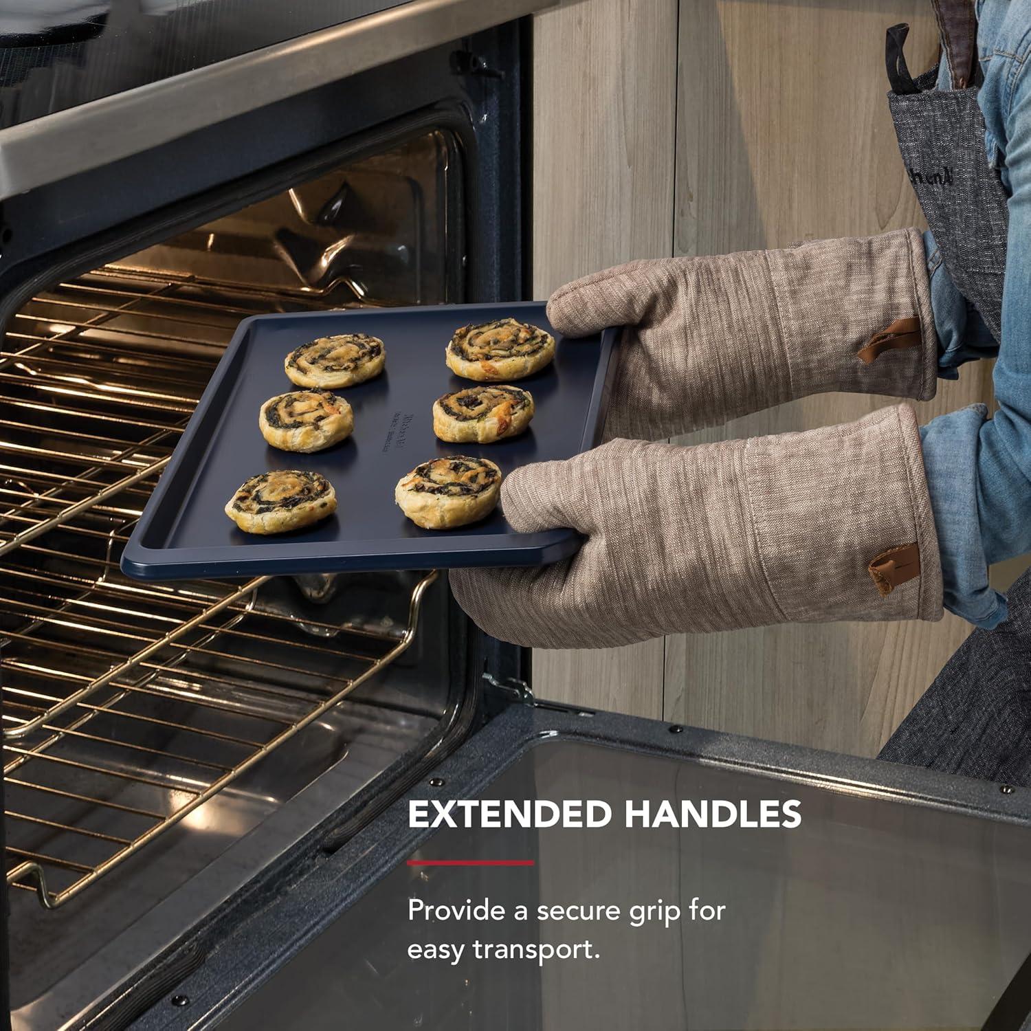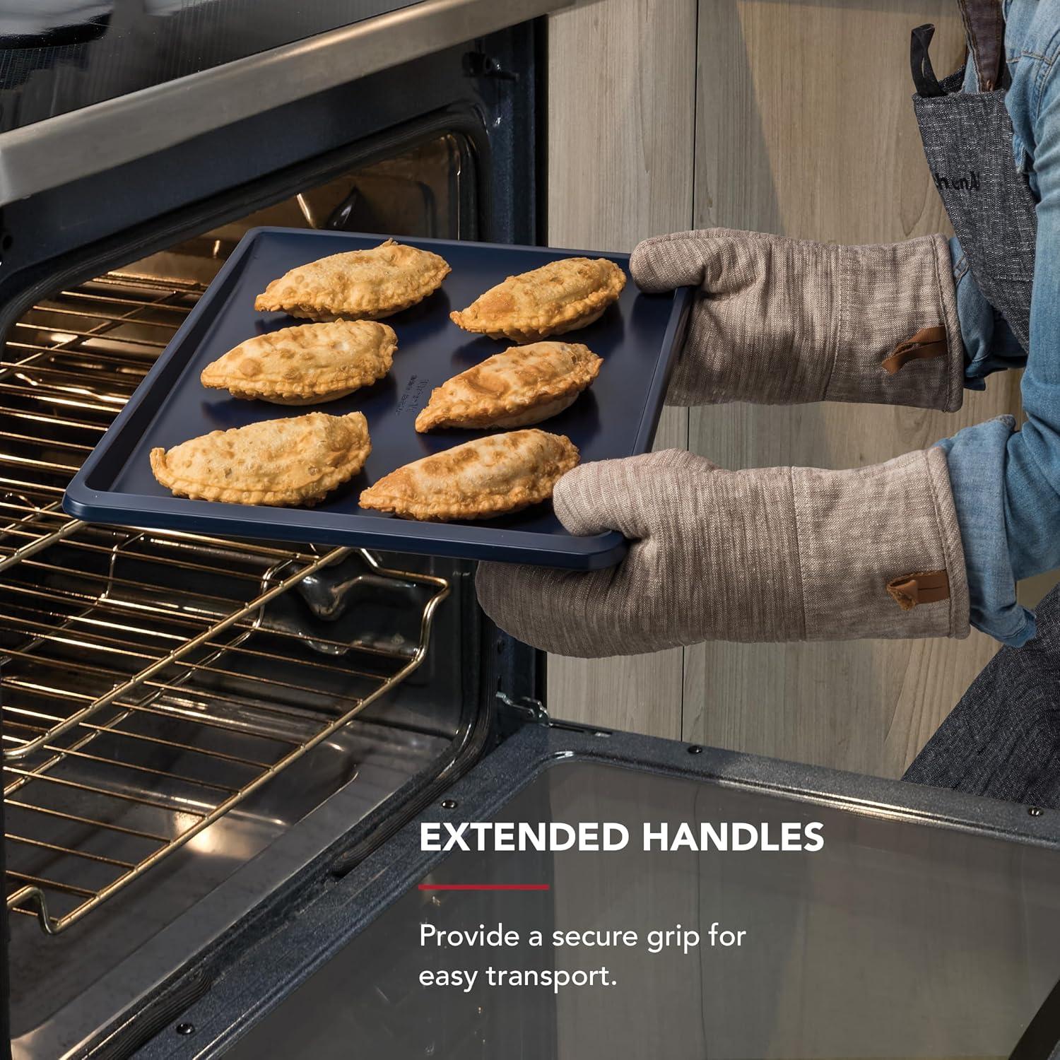 EXTENDED HANDLES: provide a secure grip for easy transport, making transferring pan in and out of the oven safer and simpler, even when wearing pot holders