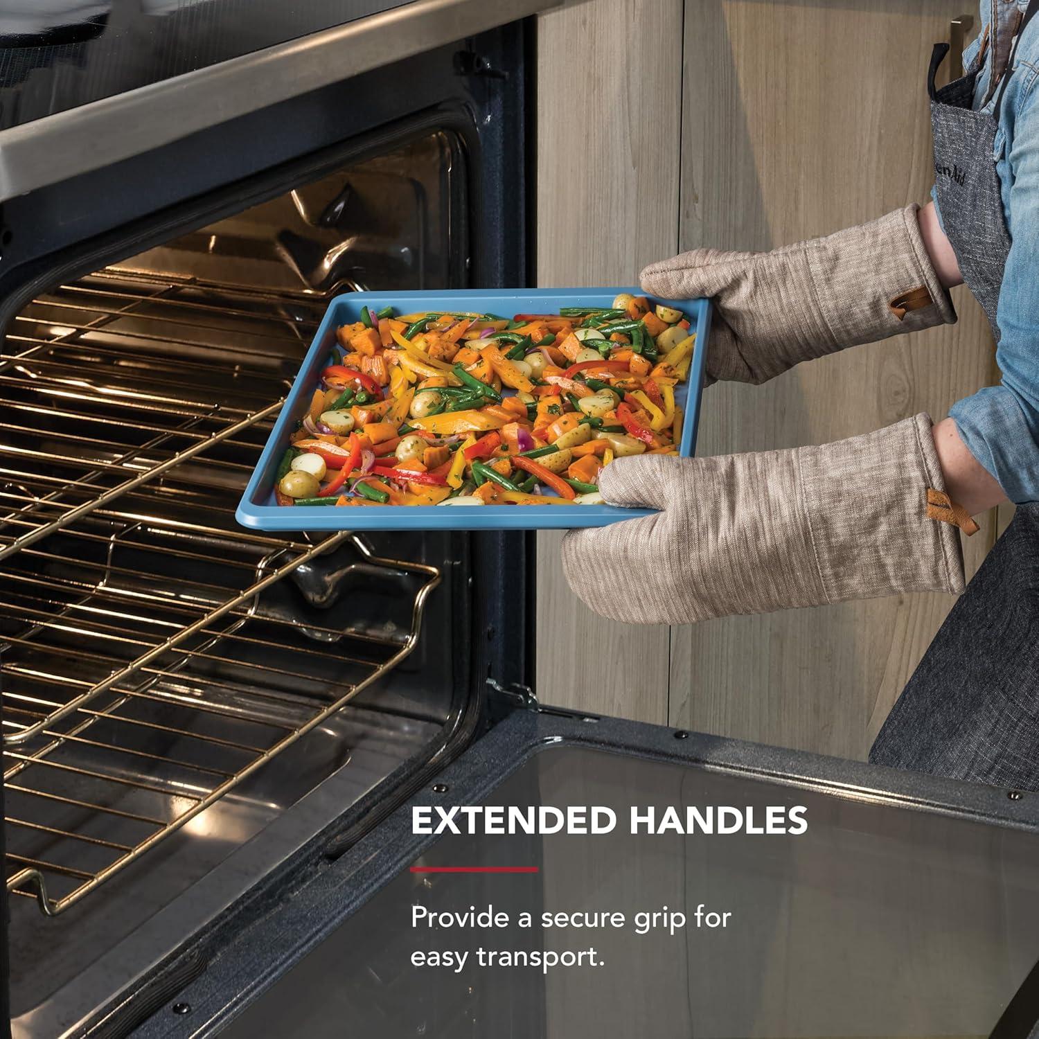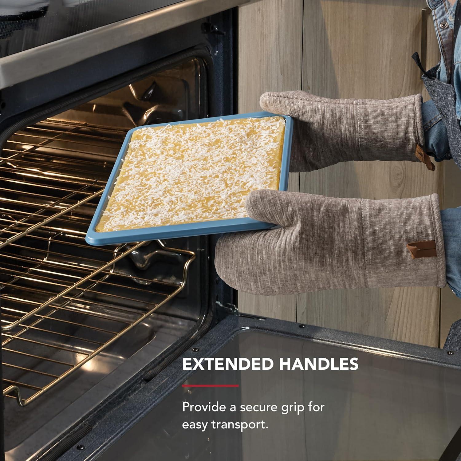 EXTENDED HANDLES: provide a secure grip for easy transport, making transferring pan in and out of the oven safer and simpler, even when wearing pot holders