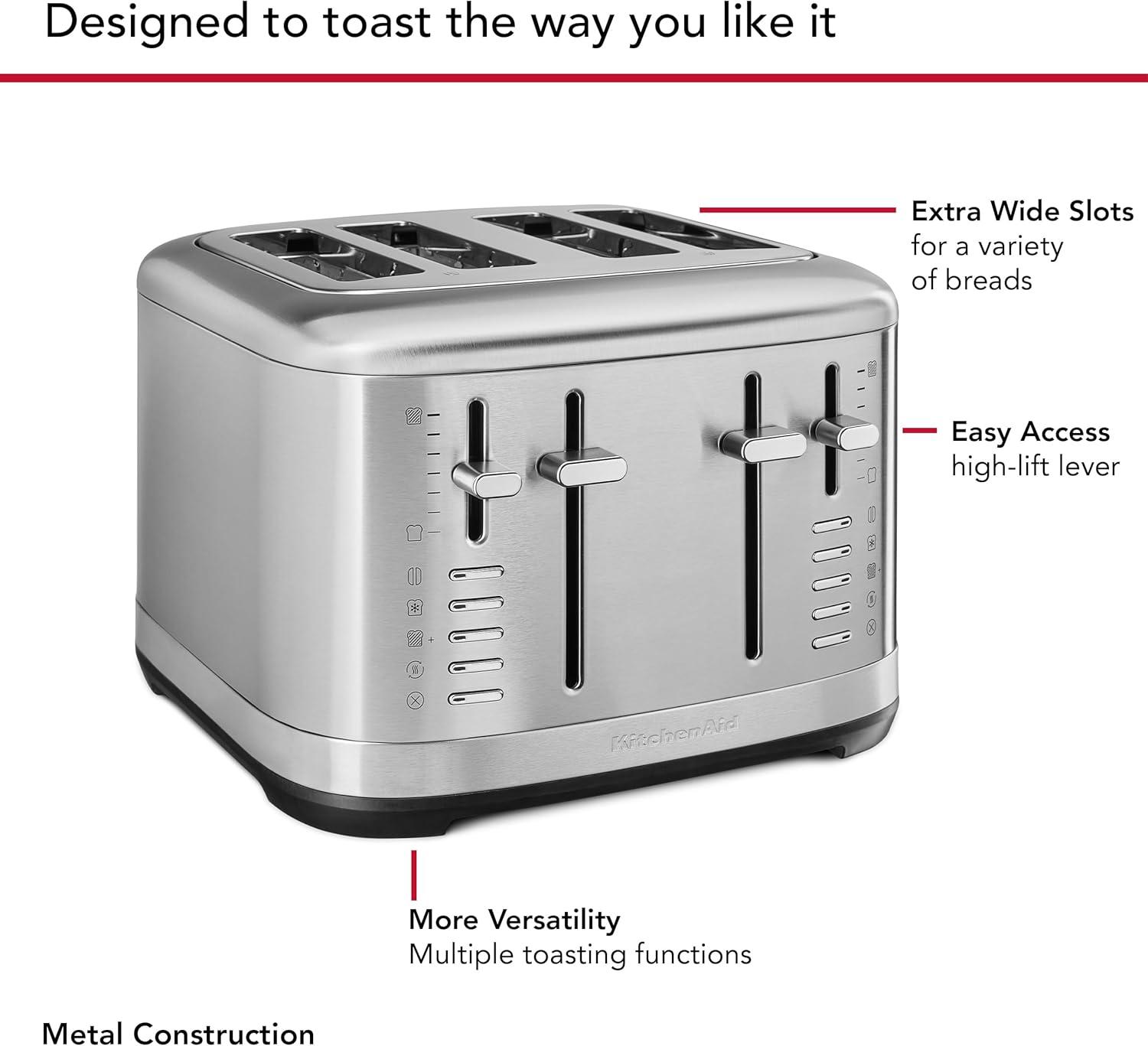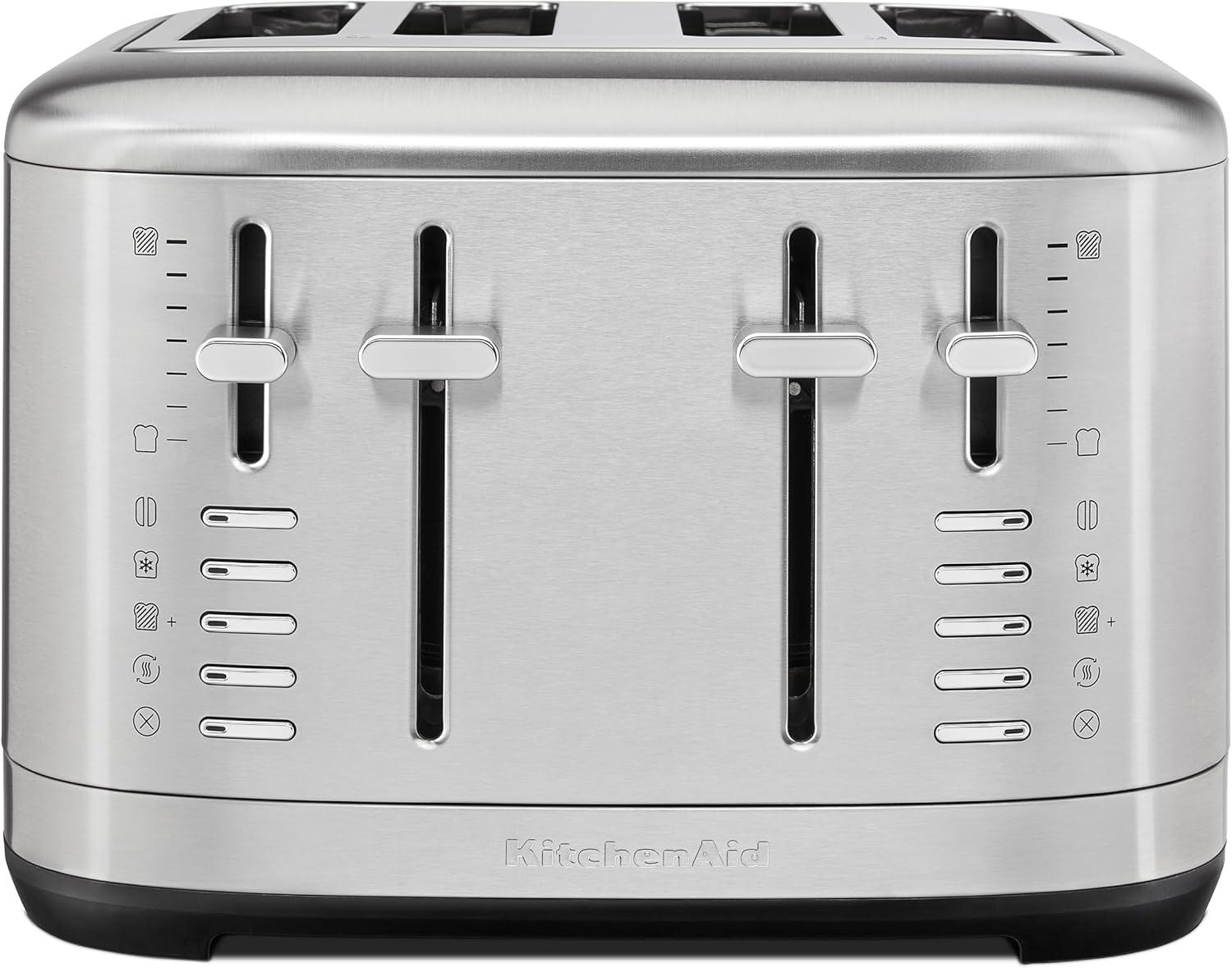 Make everyday simply delicious and easily toast your favorite breads, bagels and more with ease. This KitchenAid 4 Slice Toaster features extra-wide slots to toast a variety of shapes and sizes, including homemade or craft breads. For added convenience the adjustable shade control, from light to dark, ensures you'll have your toast just the way you like it, every time. It's built to last and the durable metal design adds style to your countertop.