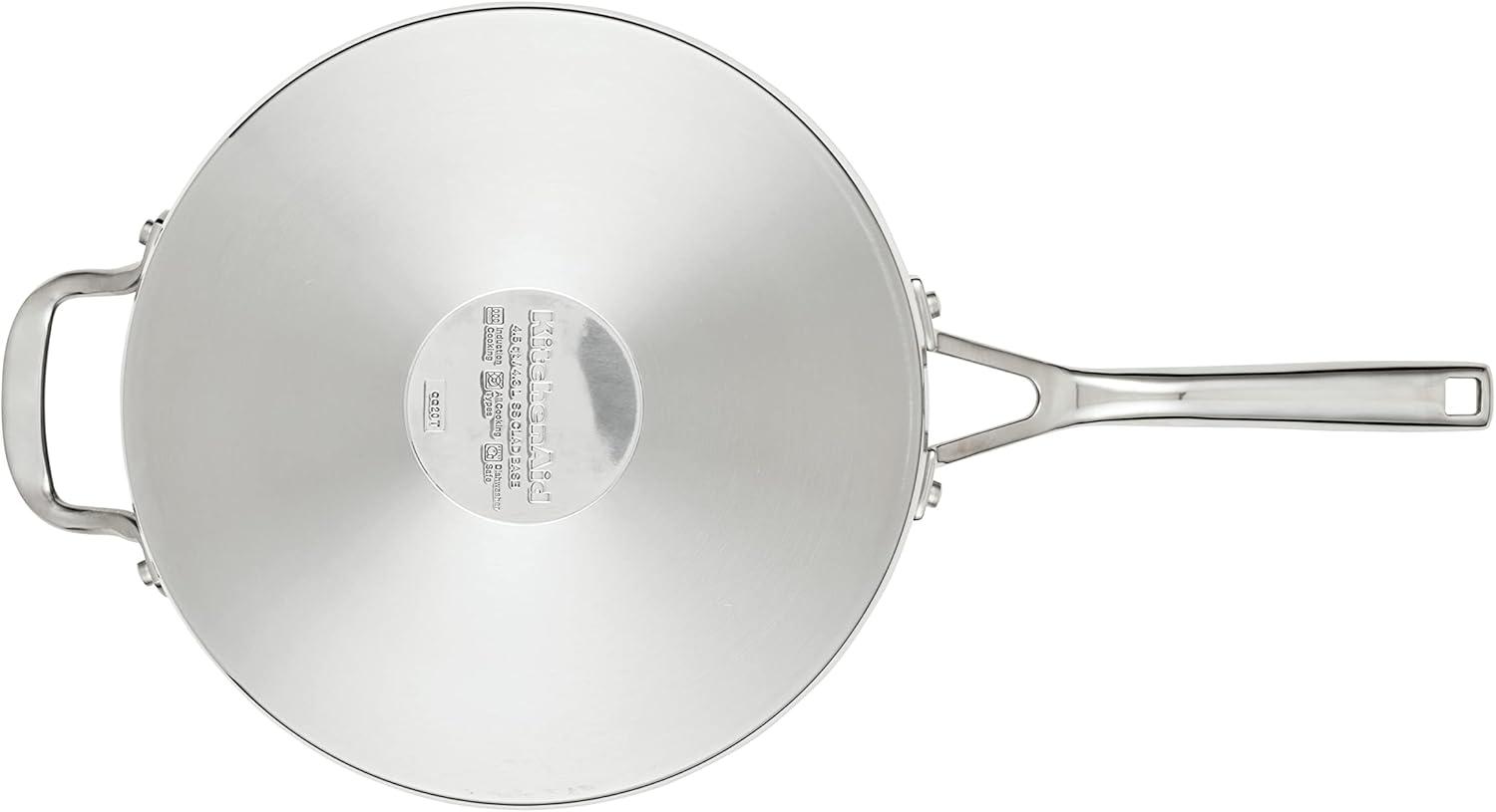 Experiment with and discover new flavors and techniques when cooking with the KitchenAid 3-Ply Base Stainless Steel Sauté Pan with Helper Handle, designed with an extra thick layer of heat-conducting aluminum to eliminate hot spots by distributing heat evenly from edge to edge. Heavy-gauge stainless steel pan features a heavy bottom induction base for lasting durability, and features high side walls for exceptional braising and cooking of sauce-based dishes. The tempered glass lid locks in heat to bring the most out of every ingredient and the dual-riveted helper handle assists when presenting the deep pan at the table. Curious cooks can investigate a wider range of recipes in the broiler and oven, where the sauté pan is safe to 500°F (350°F with lid).