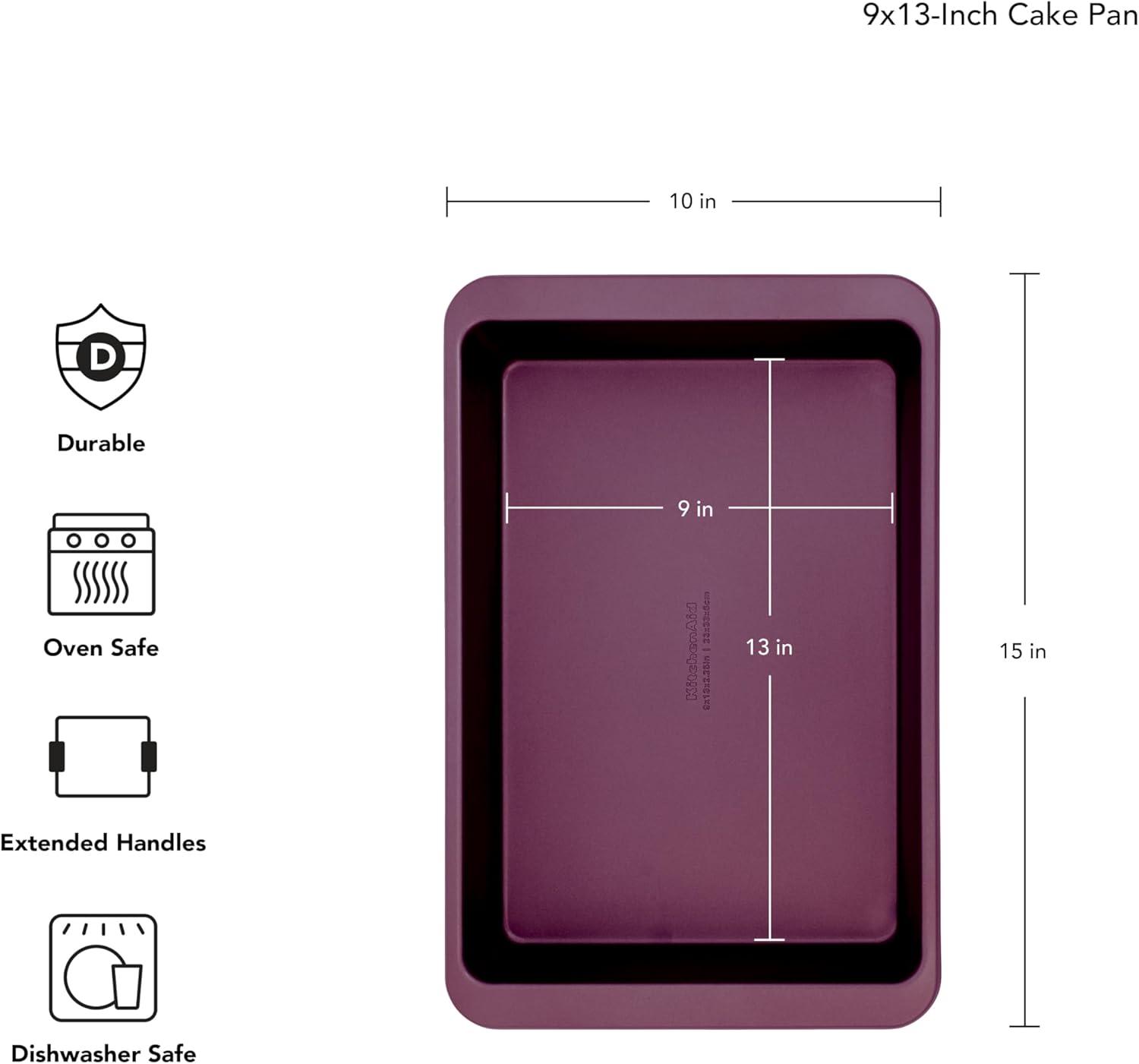 The KitchenAid 9×13 inch Cake Pan is perfect for making cakes, brownies, casseroles, and roasts. Highly durable, this nonstick, oven-safe, heavy-duty aluminized steel pan stands up to high heat for all your baking needs and features a uniquely designed rim to prevent warping. It evenly distributes heat for consistent baking results and has extended handles that provide a secure grip for easy transport. Dishwasher safe.