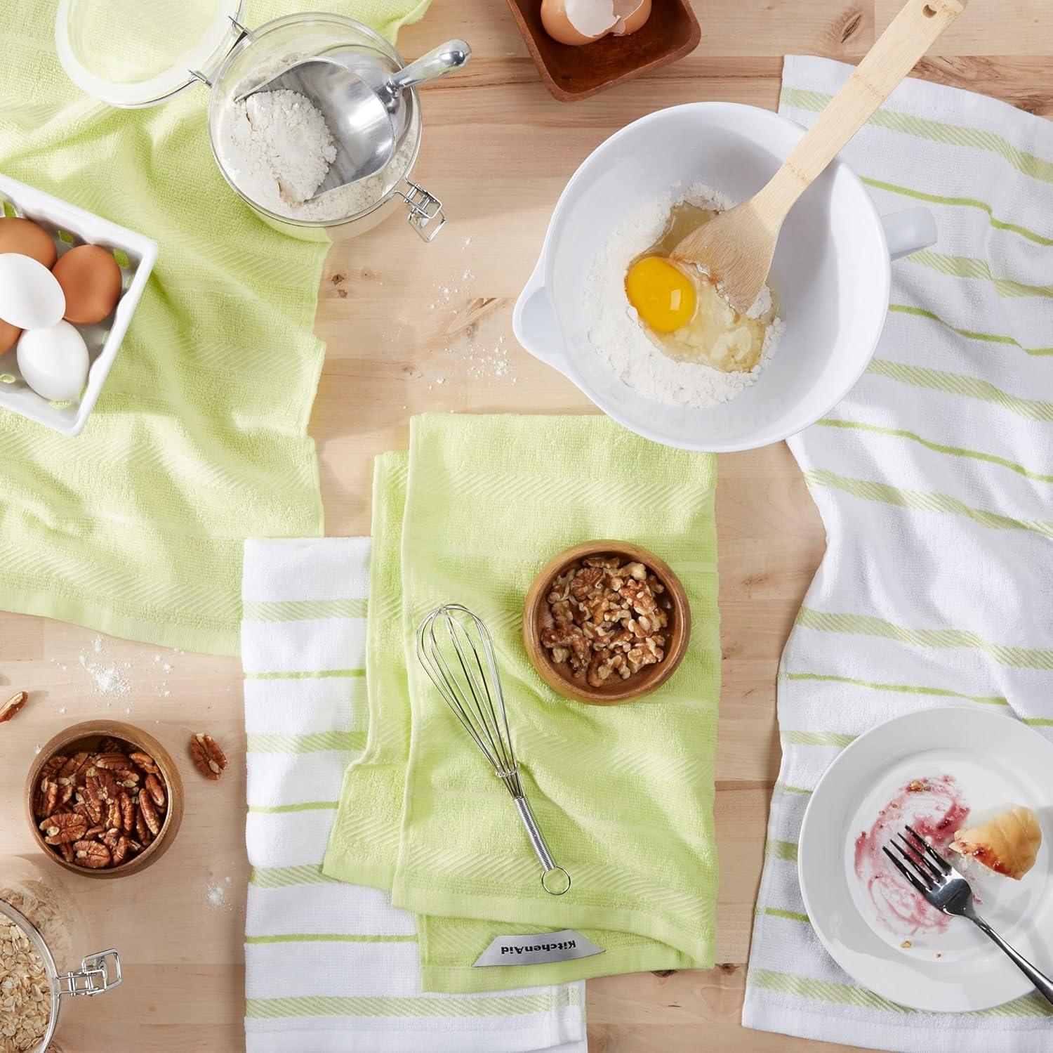 Get your kitchen chores done in classic style with the Kitchen Aid Albany Stripe Kitchen Towel 4 Piece Set. The set includes two solid kitchen towels and two striped towels that measure 16 inches wide by 26 inches long. The solid towel is made with highly-absorbent cotton and works well for wiping splatters and spills, cleaning countertops, and drying dishes since it is non-abrasive and safe for use on most kitchen surfaces. The striped kitchen towel is made with a cotton-polyester blend for durability and versatility use while tidying up. These soft kitchen towels are perfect for everyday use including daily household chores. Perfect for drying and cleaning glassware, cookware, flatware and more. While not being used, these multi-purpose kitchen towels can be used as placemats or displayed in your kitchen on hooks or on your appliances as decorative kitchen accessories. Place these kitchen towels in your kitchen, bathroom, laundry room or work area. New kitchen towel sets make the perfect gift for a housewarming or hostess gift. Easy clean machine washable. Made in India.