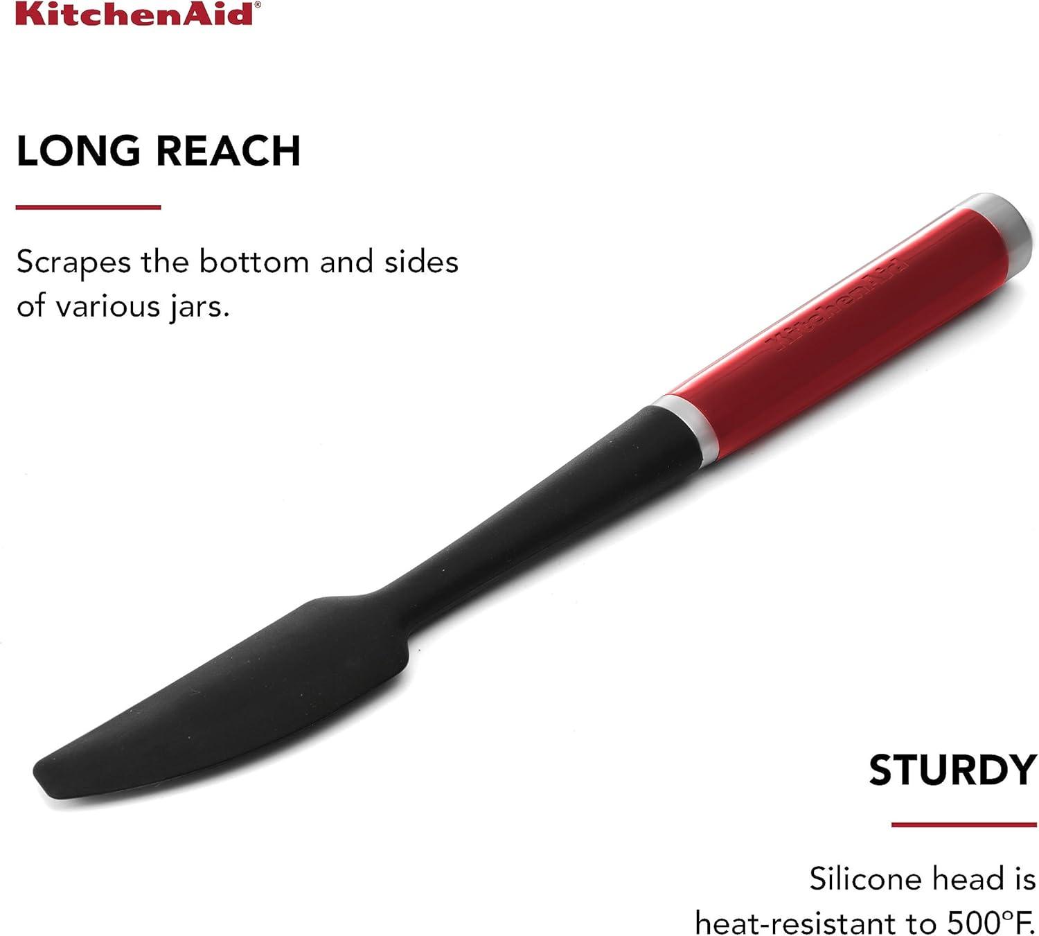 This versatile jar spatula from KitchenAid is perfect for scraping batter from bowls or sauces from pans. It’s also great also for spreading icing on cakes and pastries, or jellies and jams on bread. The spatula features a narrow head and long handle to maximize reach into even the deepest jars to easily scrape the sides and bottoms of all containers. The long, sturdy handle is ergonomically designed for optimal comfort and control. This durable spatula features a silicone head that’s heat-resistant to 500 degrees F, so it can also be used for stirring and folding in ingredients while cooking. Measures 11.3 inches by 1.2 inches. Dishwasher safe.