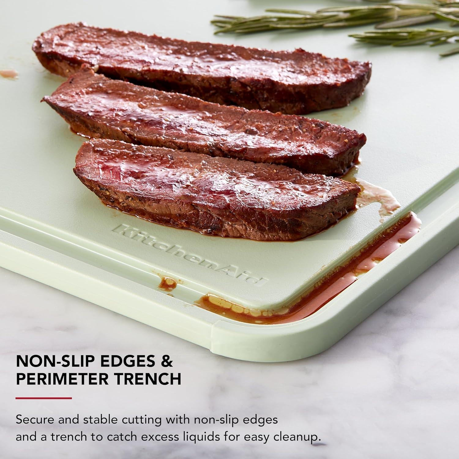 NON-SLIP EDGES & PERIMETER TRENCH: This KitchenAid cutting board offers a secure base for all your culinary tasks, featuring non-slip edges and a perimeter trench for added safety and convenience.