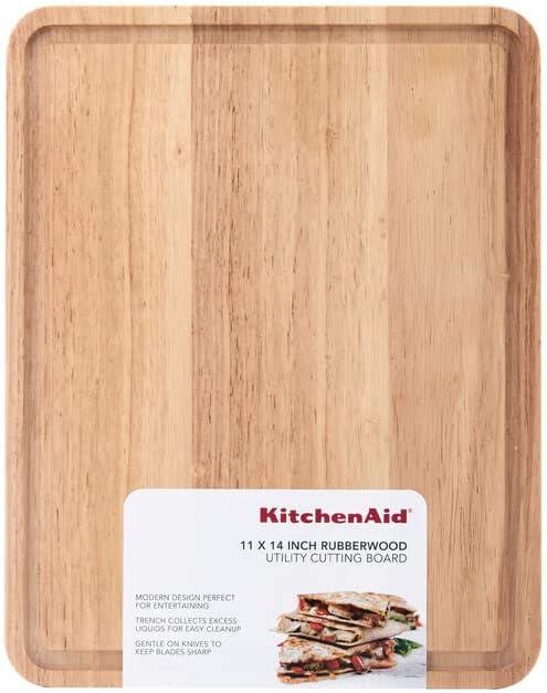 This KitchenAid® Classic 11×14 wood utility board is expertly designed to provide an exceptional experience, whether for cutting, slicing, dicing, mincing, or chopping. This utility board features a perimeter trench to catch excess liquids for easy cleanup. Crafted from rubberwood, this board is engineered to maintain its shape over time for long-lasting durability and is gentle on knives. Hand washing with warm water and a mild detergent is recommended. Dry immediately.