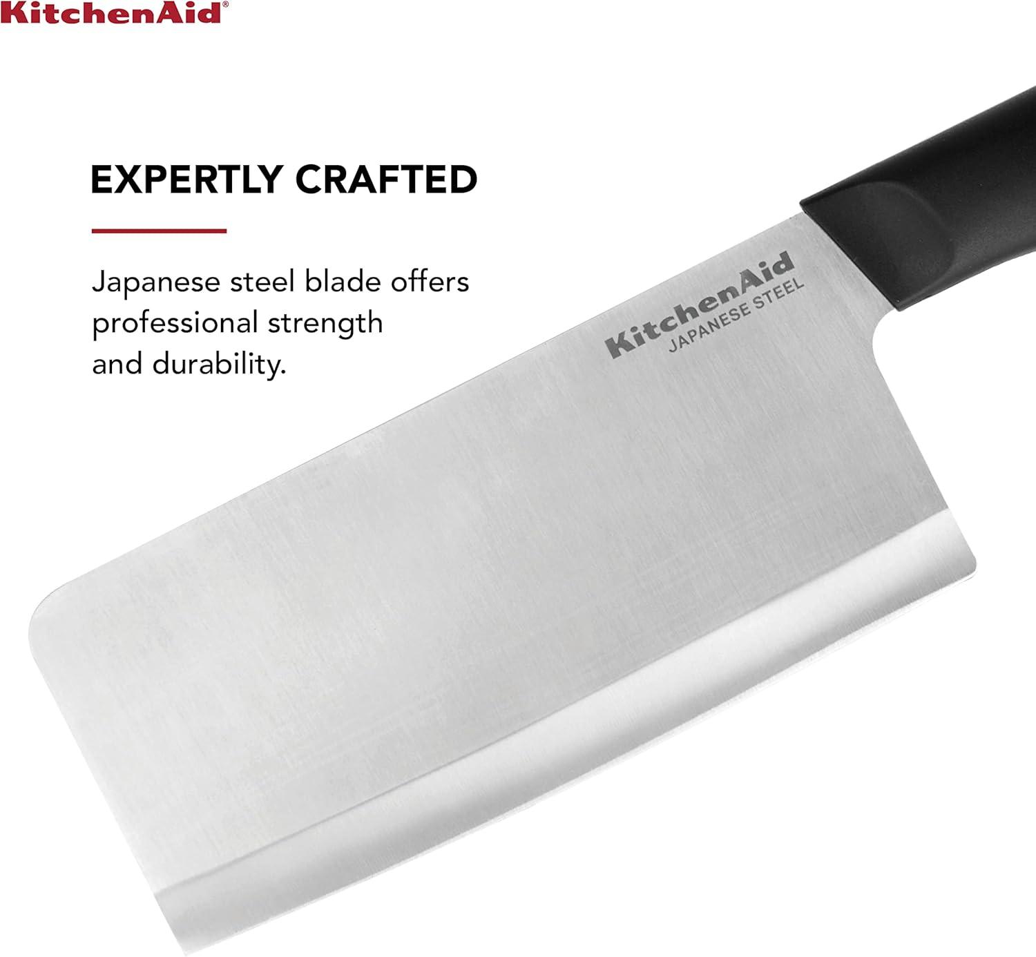 The KitchenAid® bread knife features sharp serrations to cut through a variety of soft-crusted breads and pastries with ease. Blades are expertly crafted using semi-polished, high-carbon Japanese steel, hardened and tempered to provide a long-lasting edge for a professional, quality cut every time. This KitchenAid® knife features an eastern-style ergonomic handle that provides optimal control for everyday use. This handle is expertly engineered with a textured finish for a comfortable grip and accented with a chrome endcap. Includes a custom-fit blade cover for secure, safe storage. KitchenAid® knives are top rack dishwasher safe. To extend the life of your cutlery, hand washing is recommended. Dry immediately.