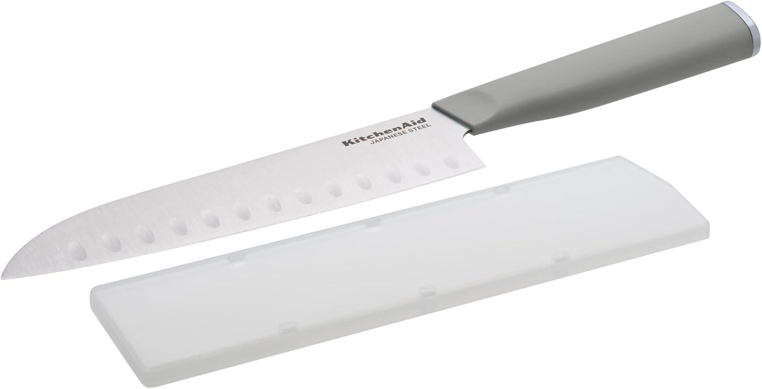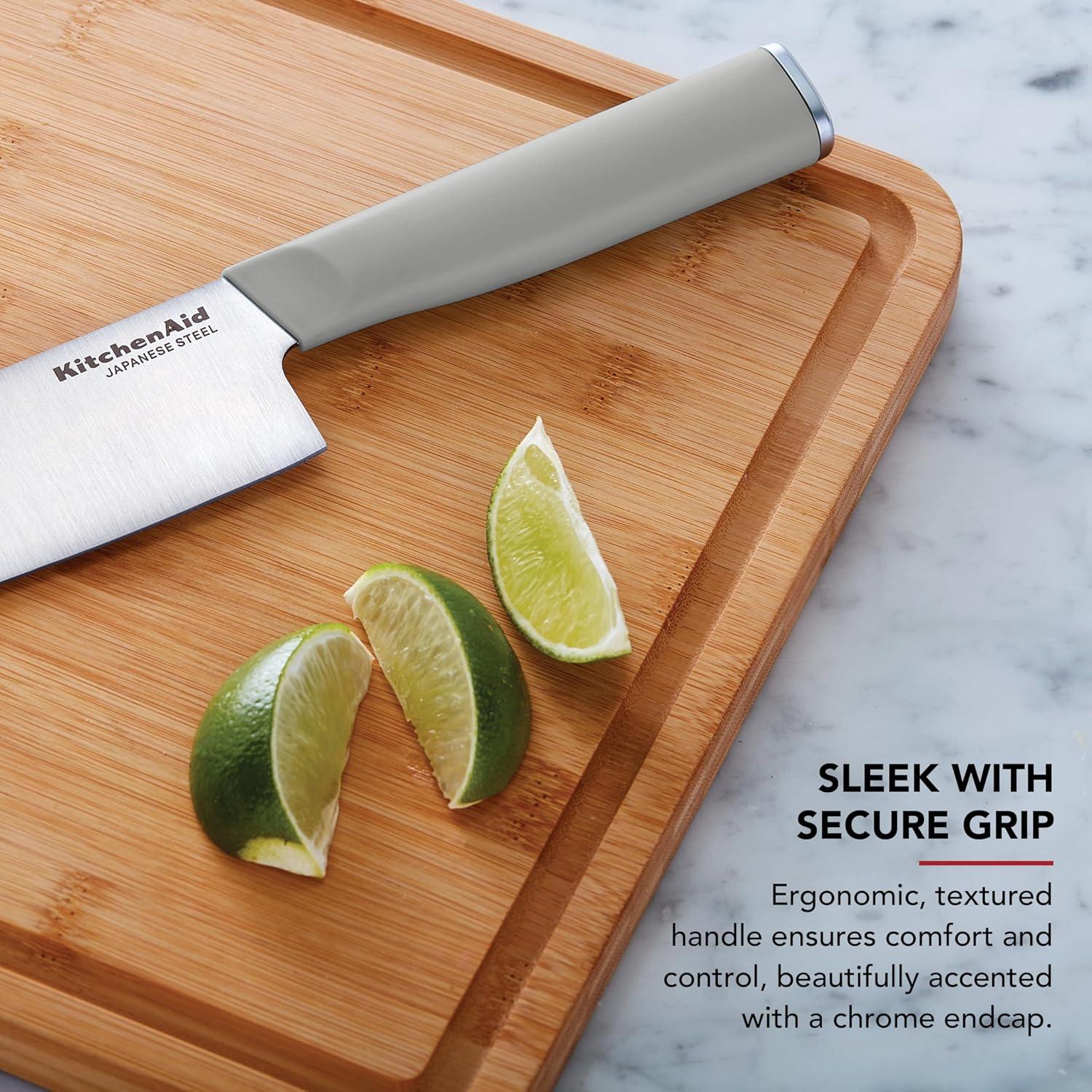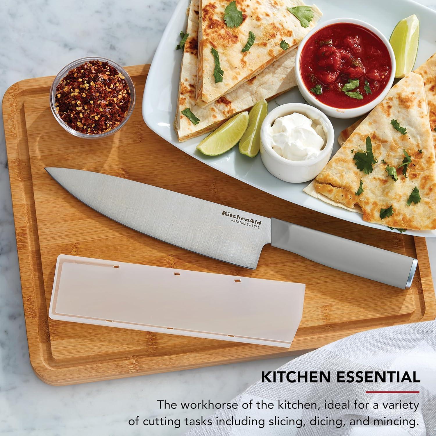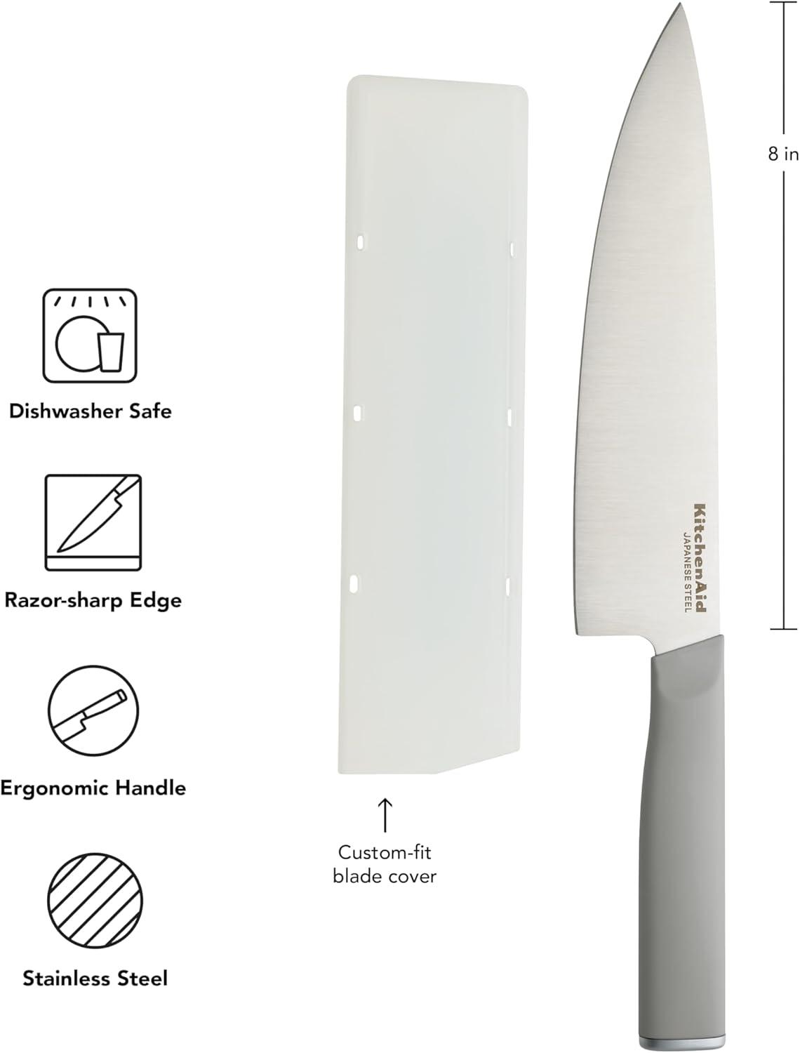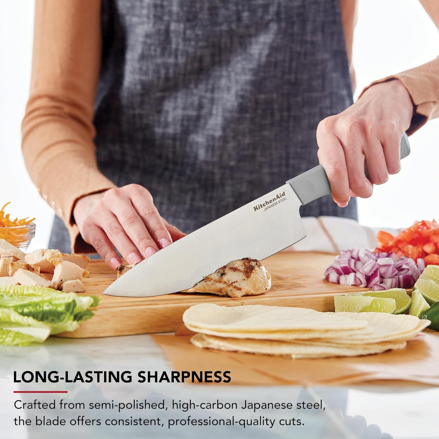 This KitchenAid 14-piece knife block set is a must-have for any culinary enthusiast or home chef. Crafted from semi-polished, high-carbon Japanese steel, these blades are hardened and tempered to ensure a durable edge for professional-quality cuts every time. Housed in a sleek and compact two-tone block with a natural wood finish on top and a white body, this comprehensive set includes an array of knives, each serving a specific purpose: an 8-inch chef knife, an 8-inch slicing knife, a 5.5-inch serrated utility knife, a 5-inch santoku knife, a 4.5-inch fine-edge utility knife, a 3.5-inch paring knife, a 3.5-inch serrated paring knife, and six 4.5-inch steak knives. The slim design of the block makes it ideal for kitchens with limited counter space, providing convenience without compromising on functionality. Additionally, the block features a built-in sharpener for easy maintenance. Ergonomic handles, designed for optimal control and comfort, are accented with chrome endcaps, adding a touch of elegance. With its razor-sharp performance, elegant design, and aesthetic appeal, this KitchenAid knife block set is the perfect addition to your kitchen, ensuring you're always prepared for any meal prep needs. These KitchenAid knives are dishwasher safe on the top rack for convenient cleanup, though hand washing is recommended for extended longevity. Dry immediately for best results.