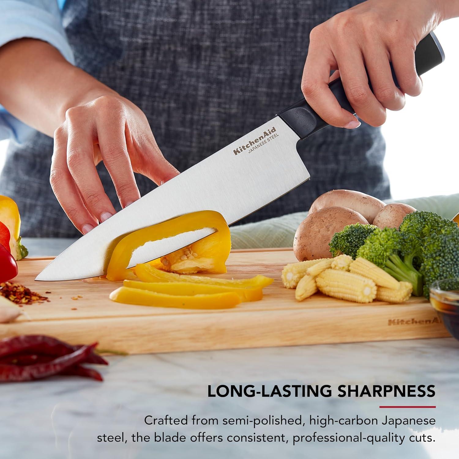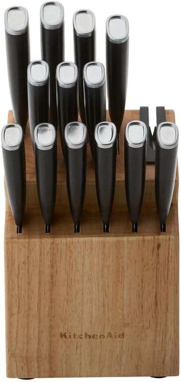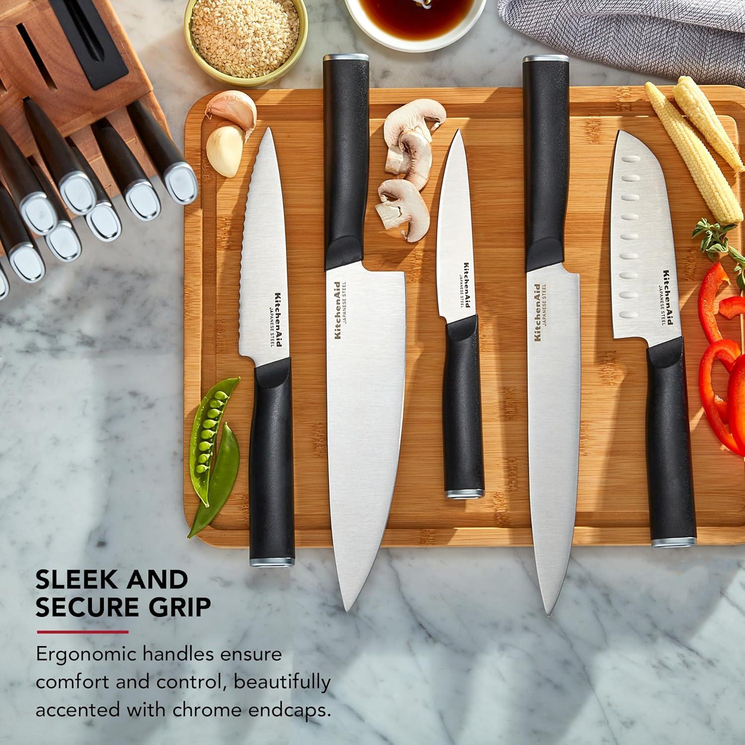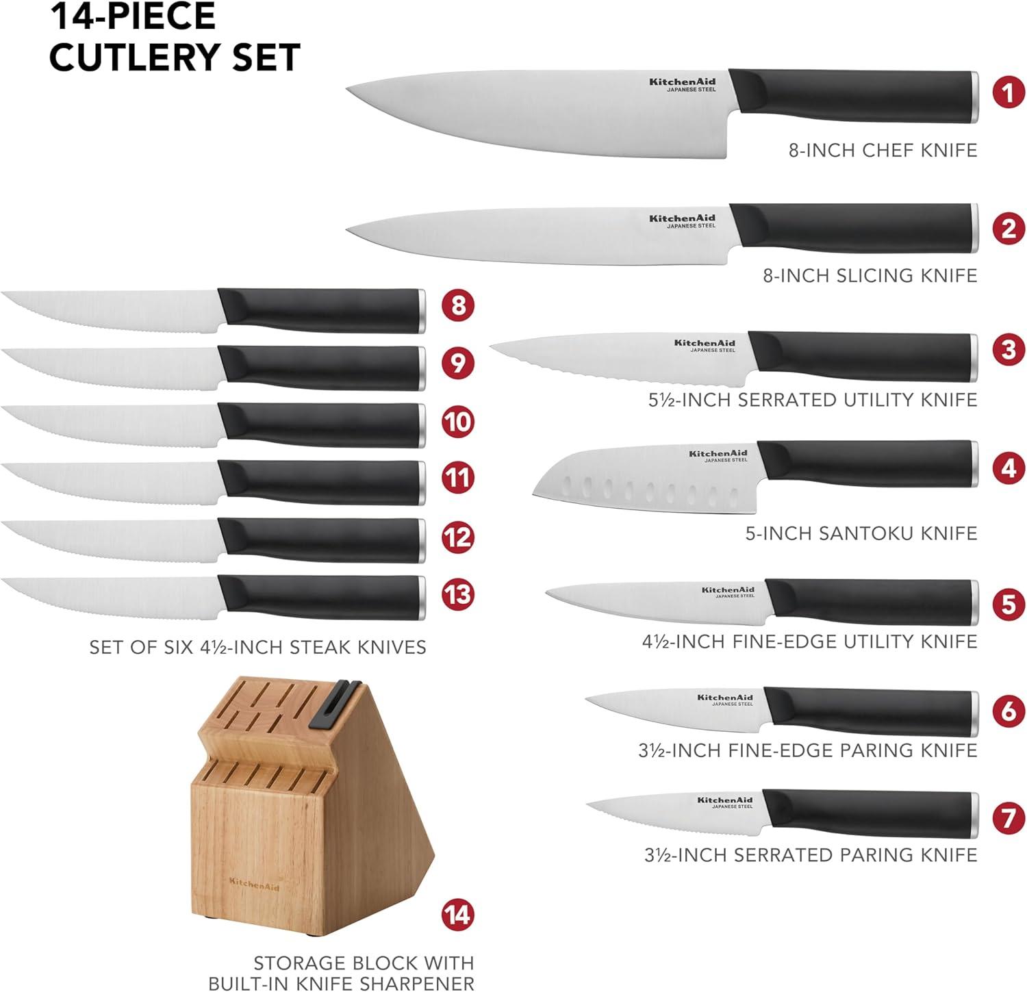 This KitchenAid 14-piece knife block set is a must-have for any culinary enthusiast or home chef. Crafted from semi-polished, high-carbon Japanese steel, these blades are hardened and tempered to ensure a durable edge for professional-quality cuts every time. Housed in a sleek and compact two-tone block with a natural wood finish on top and a white body, this comprehensive set includes an array of knives, each serving a specific purpose: an 8-inch chef knife, an 8-inch slicing knife, a 5.5-inch serrated utility knife, a 5-inch santoku knife, a 4.5-inch fine-edge utility knife, a 3.5-inch paring knife, a 3.5-inch serrated paring knife, and six 4.5-inch steak knives. The slim design of the block makes it ideal for kitchens with limited counter space, providing convenience without compromising on functionality. Additionally, the block features a built-in sharpener for easy maintenance. Ergonomic handles, designed for optimal control and comfort, are accented with chrome endcaps, adding a touch of elegance. With its razor-sharp performance, elegant design, and aesthetic appeal, this KitchenAid knife block set is the perfect addition to your kitchen, ensuring you're always prepared for any meal prep needs. These KitchenAid knives are dishwasher safe on the top rack for convenient cleanup, though hand washing is recommended for extended longevity. Dry immediately for best results.