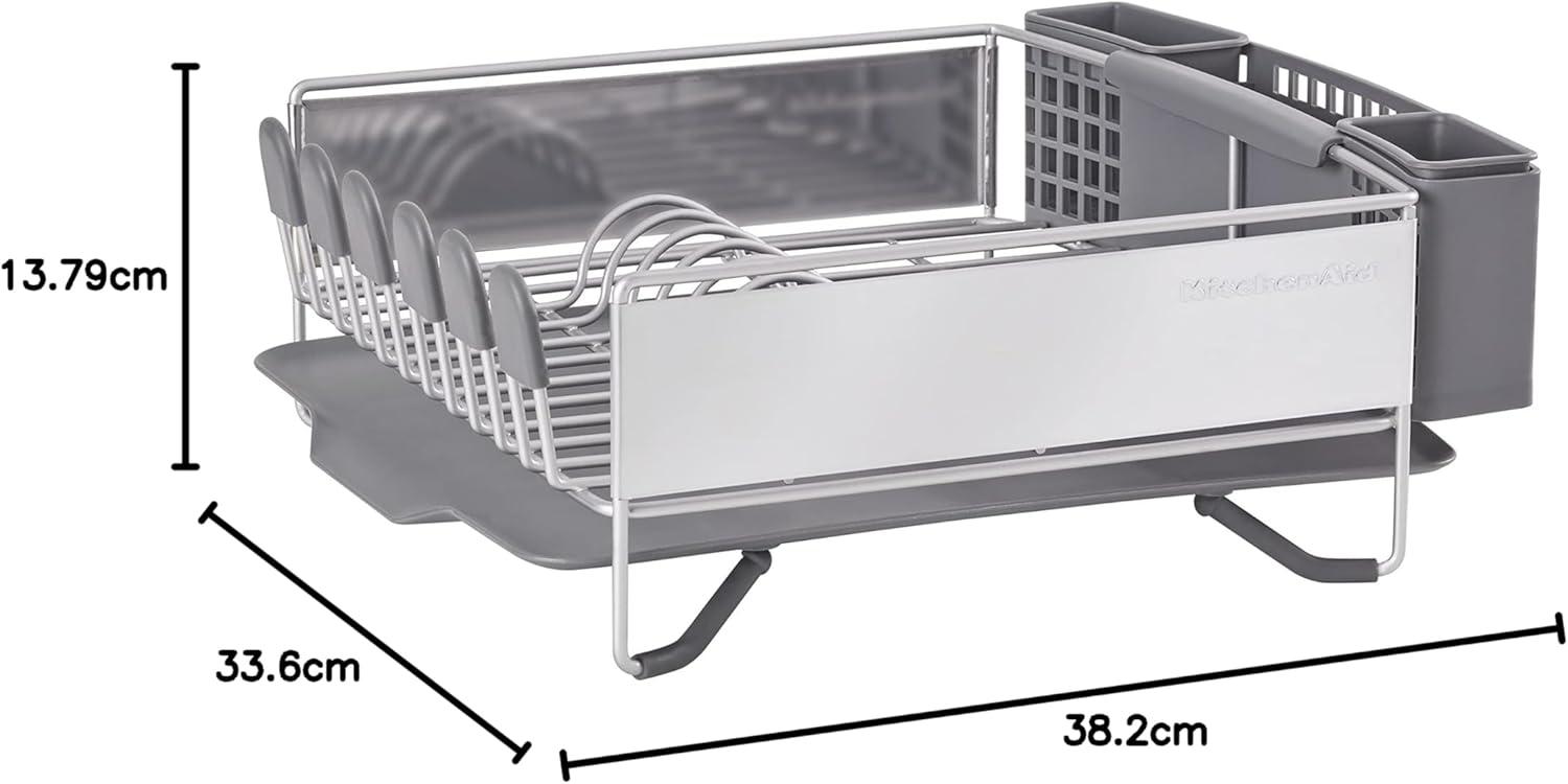 KitchenAid Compact Space Saving, Dish Rack with Removable Flatware Caddy and Angled Self Draining Drainboard, Satin Gray, 15-Inch-by-13.25-Inch(Gray)
