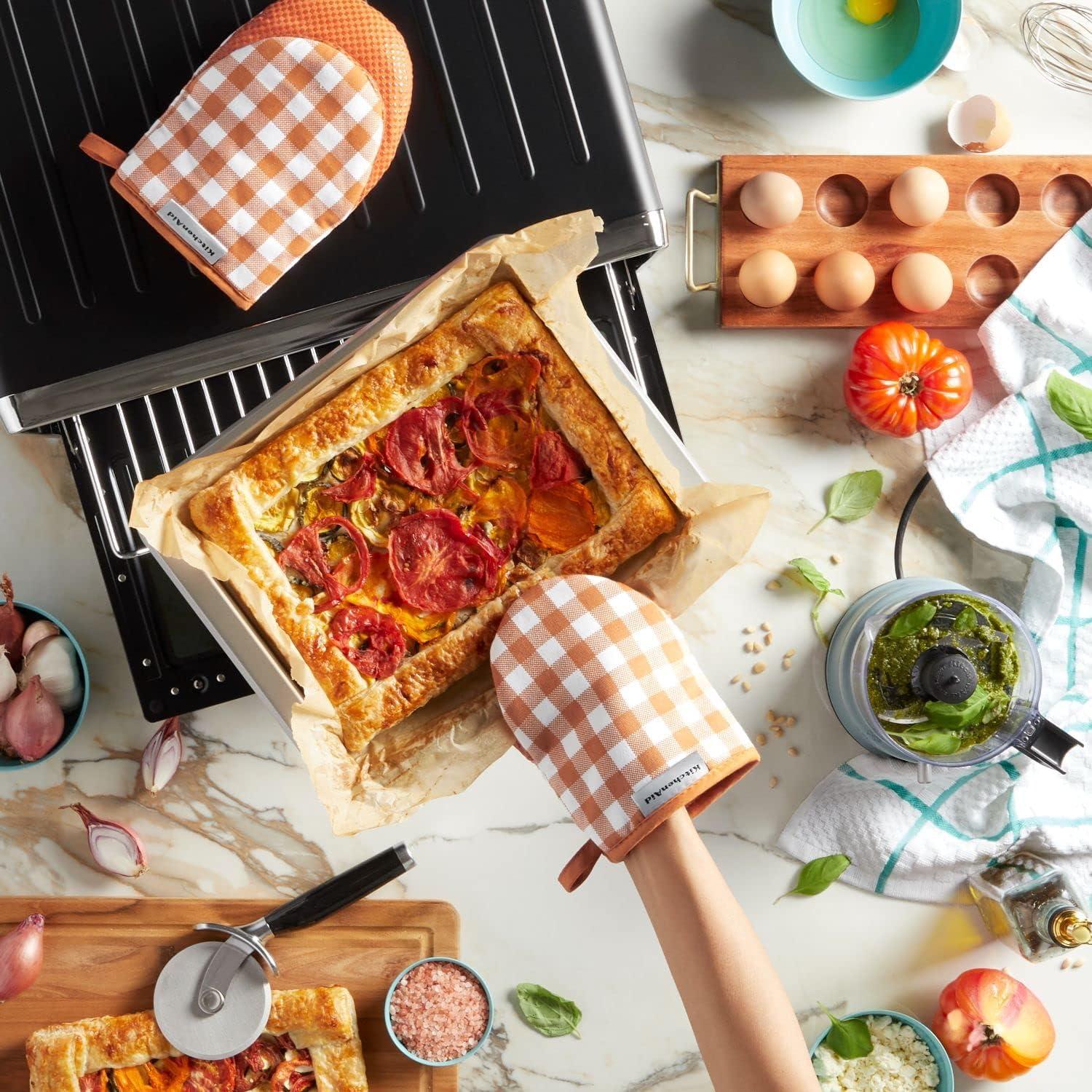 SET OF TWO: Set includes two (2) KitchenAid Gingham Mini Mitts with a classic checkered pattern, each measuring 5.5″ W x 8″ L.