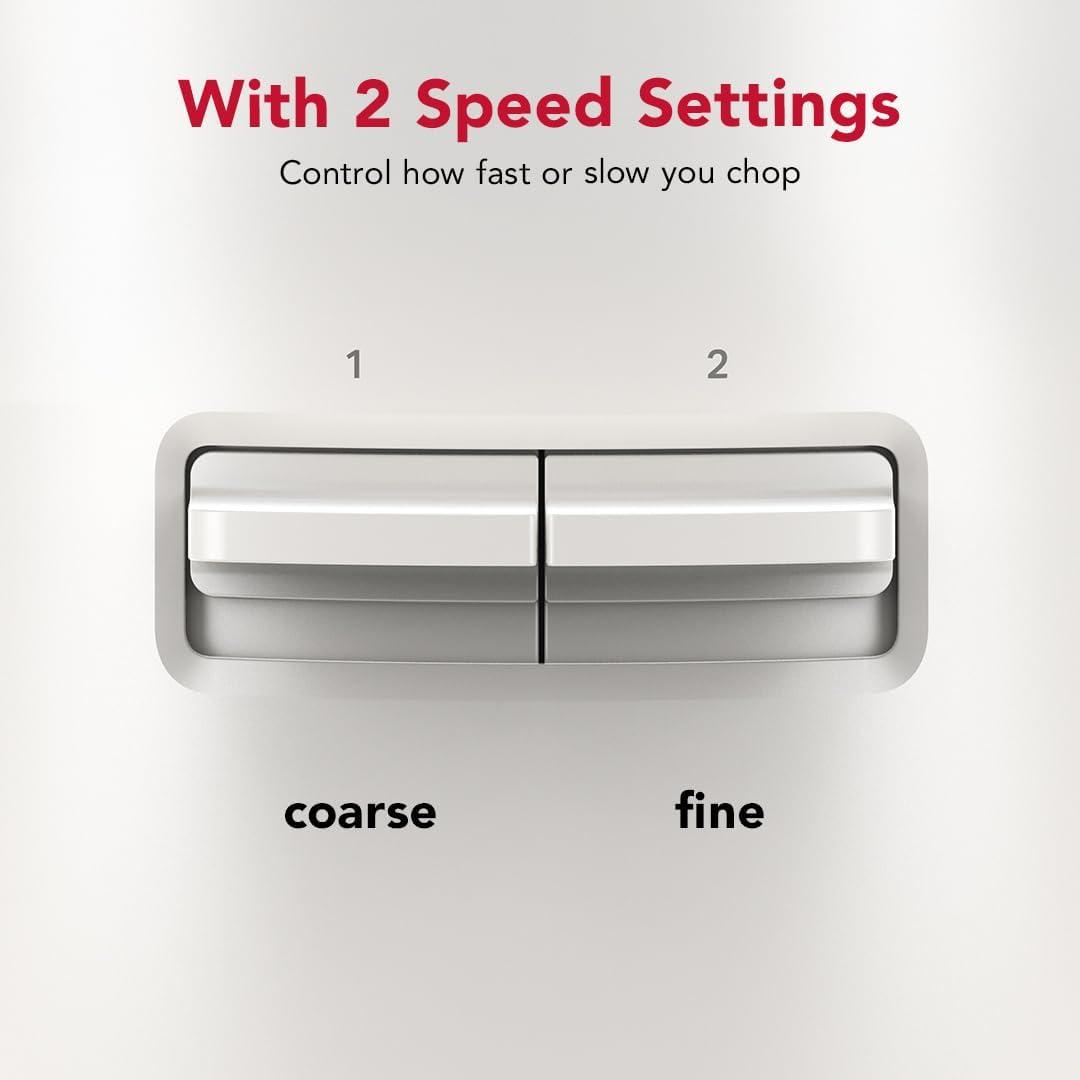 Save space with the all-in-one storage design that stores blades and discs right in the work bowl. With 2 Speed Settings control how fast or slow you chop, for coarse or fine chopping