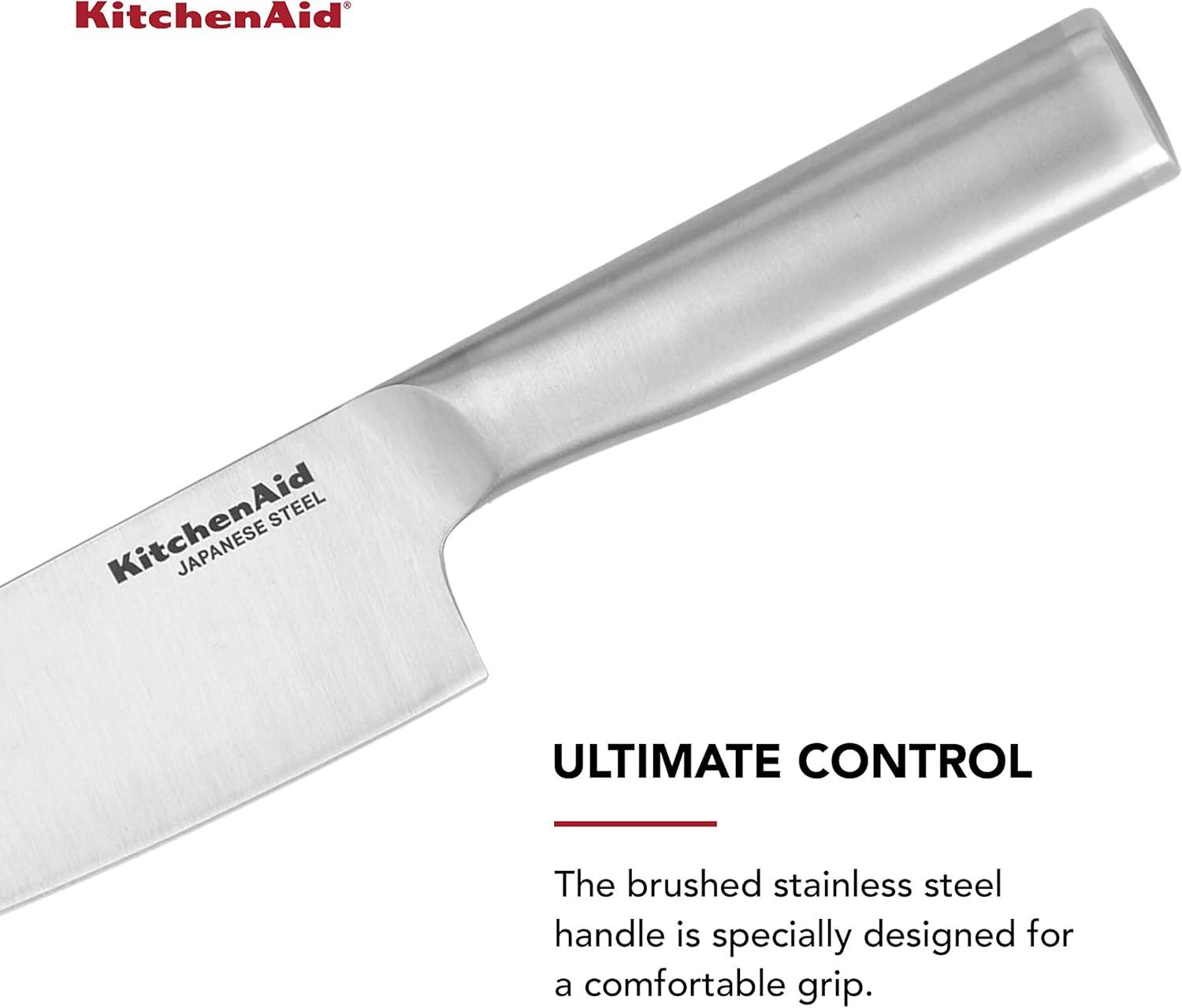 The KitchenAid chef knife is the workhorse of the kitchen, ideal for a variety of cutting tasks including slicing, dicing and, mincing. This forged knife is expertly crafted using semi-polished, high-carbon imported Japanese steel, hardened and tempered to provide a long-lasting edge for a professional, quality cut every time. This KitchenAid knife features an eastern-style ergonomic handle that provides optimal control for everyday use. This handle is expertly engineered in a brushed stainless steel finish for a comfortable grip, and accented with a polished endcap. Includes a custom-fit blade cover for secure, safe storage. KitchenAid knives are top rack dishwasher safe. To extend the life of your cutlery, hand washing is recommended. Dry immediately.