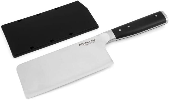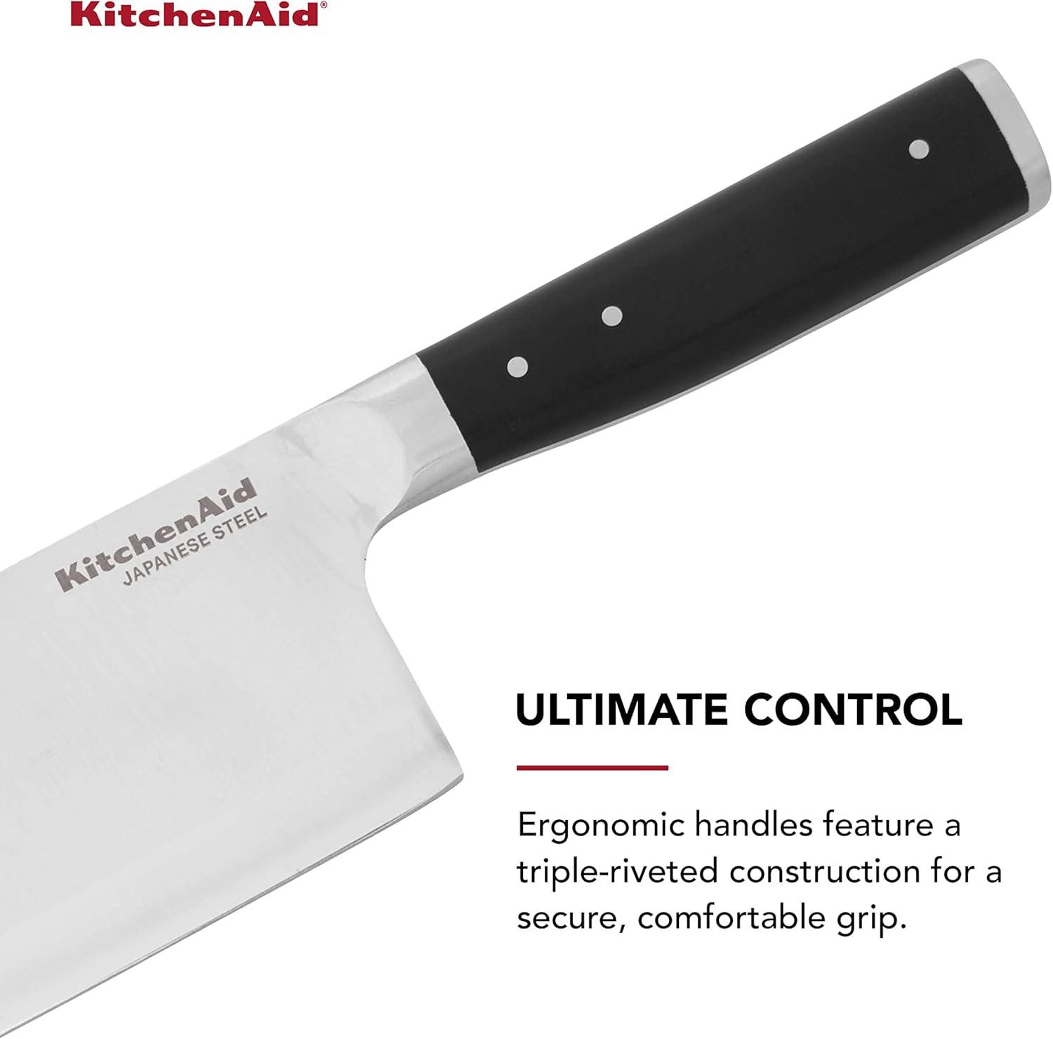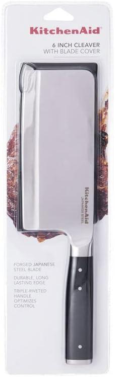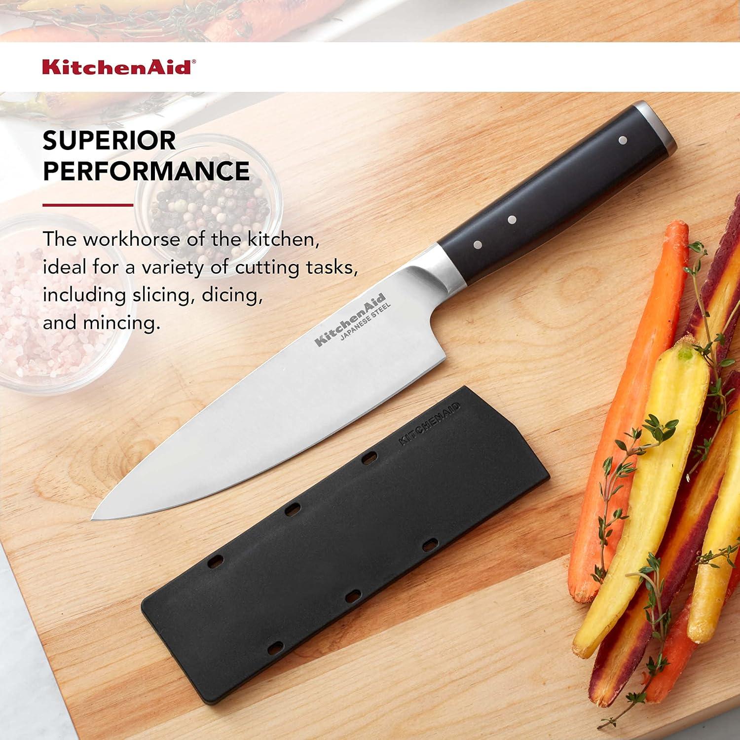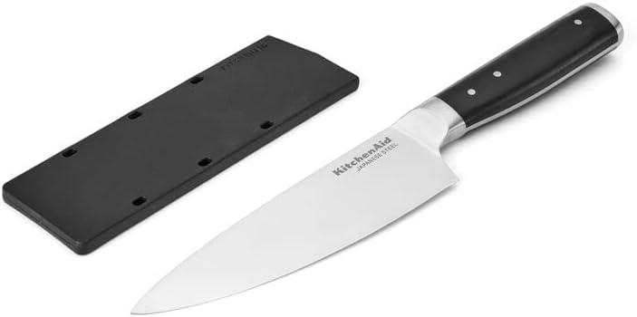 The KitchenAid® bread knife features sharp serrations to cut through a variety of soft-crusted breads and pastries with ease. This forged knife is expertly crafted using semi-polished, high-carbon Japanese steel, hardened and tempered to provide a long-lasting edge for a professional, quality cut every time. This KitchenAid® knife features an eastern-style ergonomic handle with a triple-riveted pin design that provides optimal control for everyday use. This handle is expertly engineered with a textured finish for a comfortable grip and accented with a stainless steel endcap. Includes a custom-fit blade cover for secure, safe storage. KitchenAid® knives are top rack dishwasher safe. To extend the life of your cutlery, hand washing is recommended. Dry immediately.