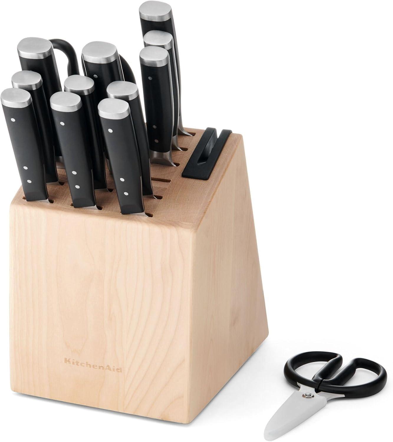 KitchenAid Gourmet Forged Triple Rivet Knife Block Set with Built-in Knife Sharpener, High Carbon Japanese Stainless Steel Kitchen Knives, Sharp Kitchen Knife Set with Block, Birchwood, 14-Piece(Birchwood)
