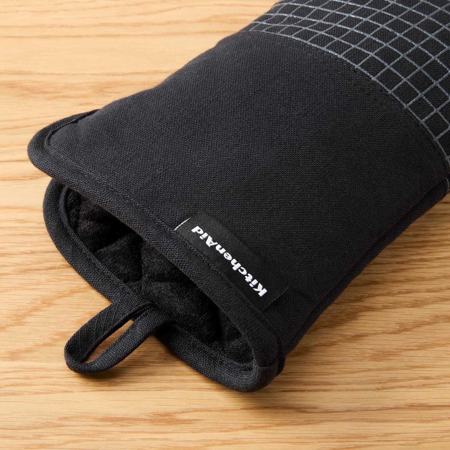 Protect your hands with the KitchenAid Gourmet Series Gridlines Oven Mitt 2-Pack Set. Heat resistant up to 600°F, these oven mitts feature slip-resistant silicone grips with a windowpane grid design, extra-thick padding for added protection, and a 100% cotton exterior with polyester lining. Designed for convenience, they include magnetic cuffs and hanging loops for easy storage and are machine washable for hassle-free cleaning. Stylish and functional, they’re perfect for any kitchen task. Coordinate with KitchenAid kitchen linens and tools for a cohesive look.