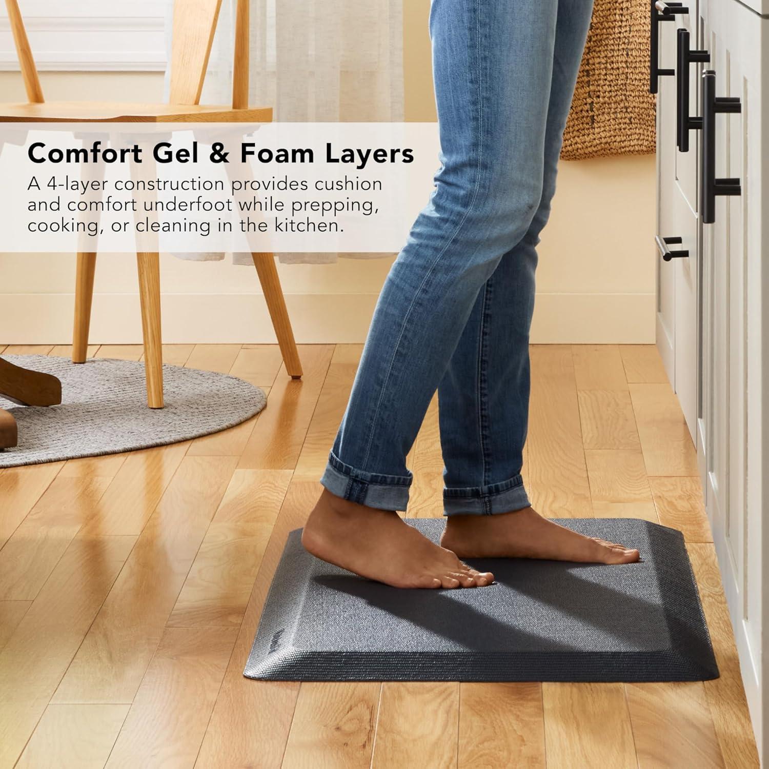 Add a dose of comfort and style with the KitchenAid Gourmet Series Kitchen Comfort Gel Mat. With a 4-layer construction, this mat provides cushion and support underfoot while you prep, cook and clean in the kitchen. With a water and stain-resistant top for easy cleaning, a soft gel layer, a thick foam core, and a non-slip bottom, this kitchen mat provides cushioning and support for feet and legs, making it perfect for standing on hard floors. Enhanced with beveled edges for a smooth floor transition, this comfort mat is ideal for any kitchen. Coordinate with your KitchenAid kitchen textiles and appliances for a cohesive look.