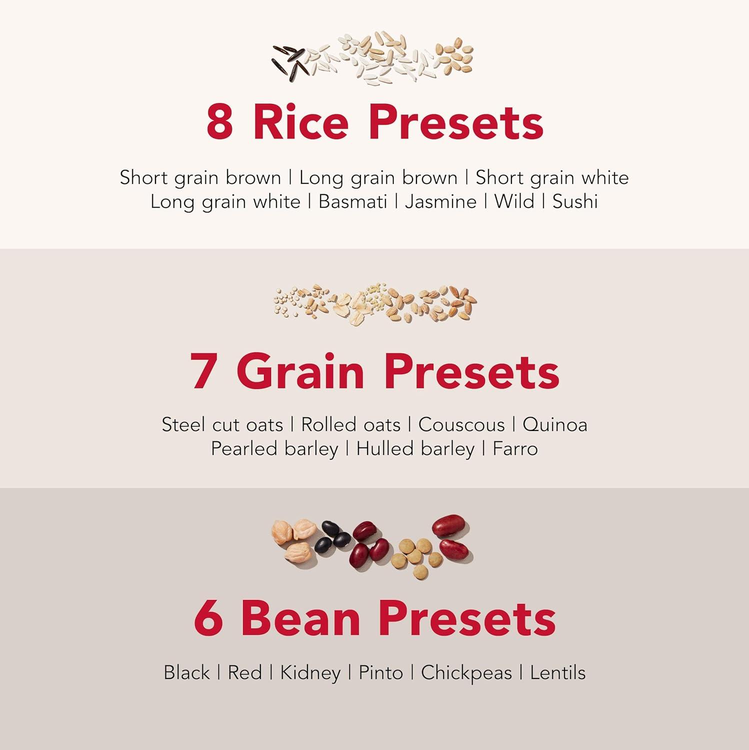 Explore a whole new world of whole grains with 21 preset options for rice, beans, oats, couscous, quinoa, barley, farro and more