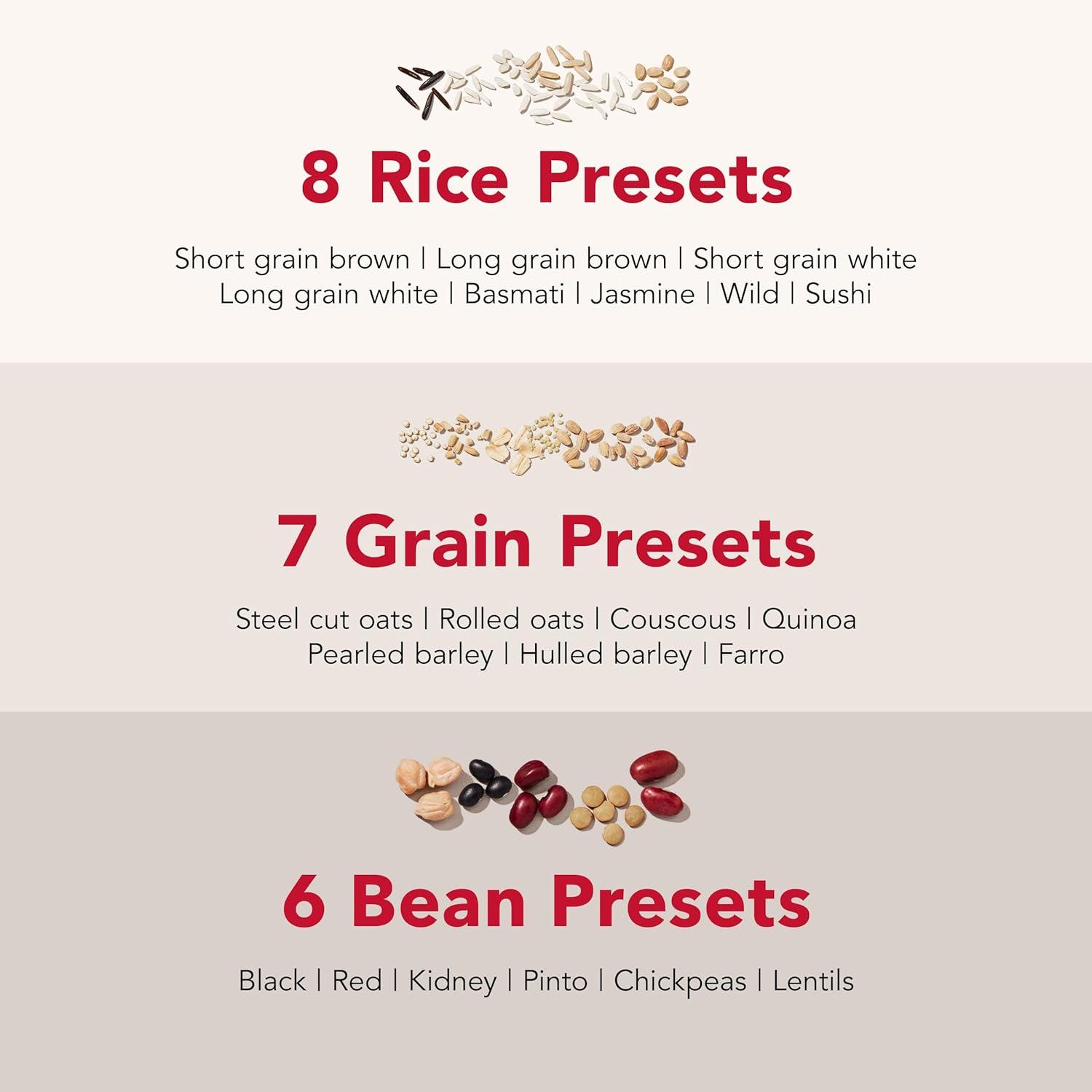 Explore a whole new world of whole grains with 21 preset options for rice, beans, oats, couscous, quinoa, barley, farro and more