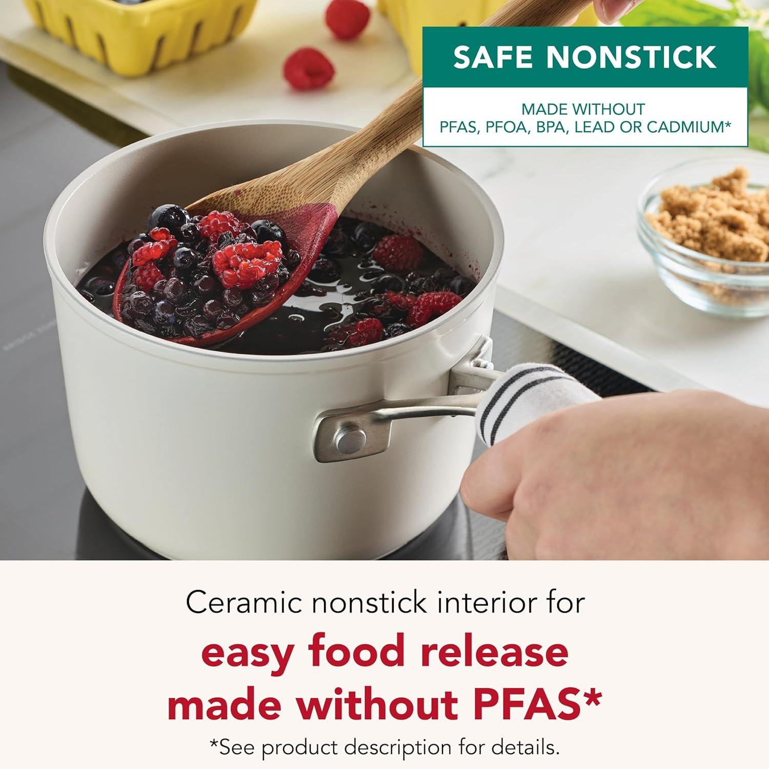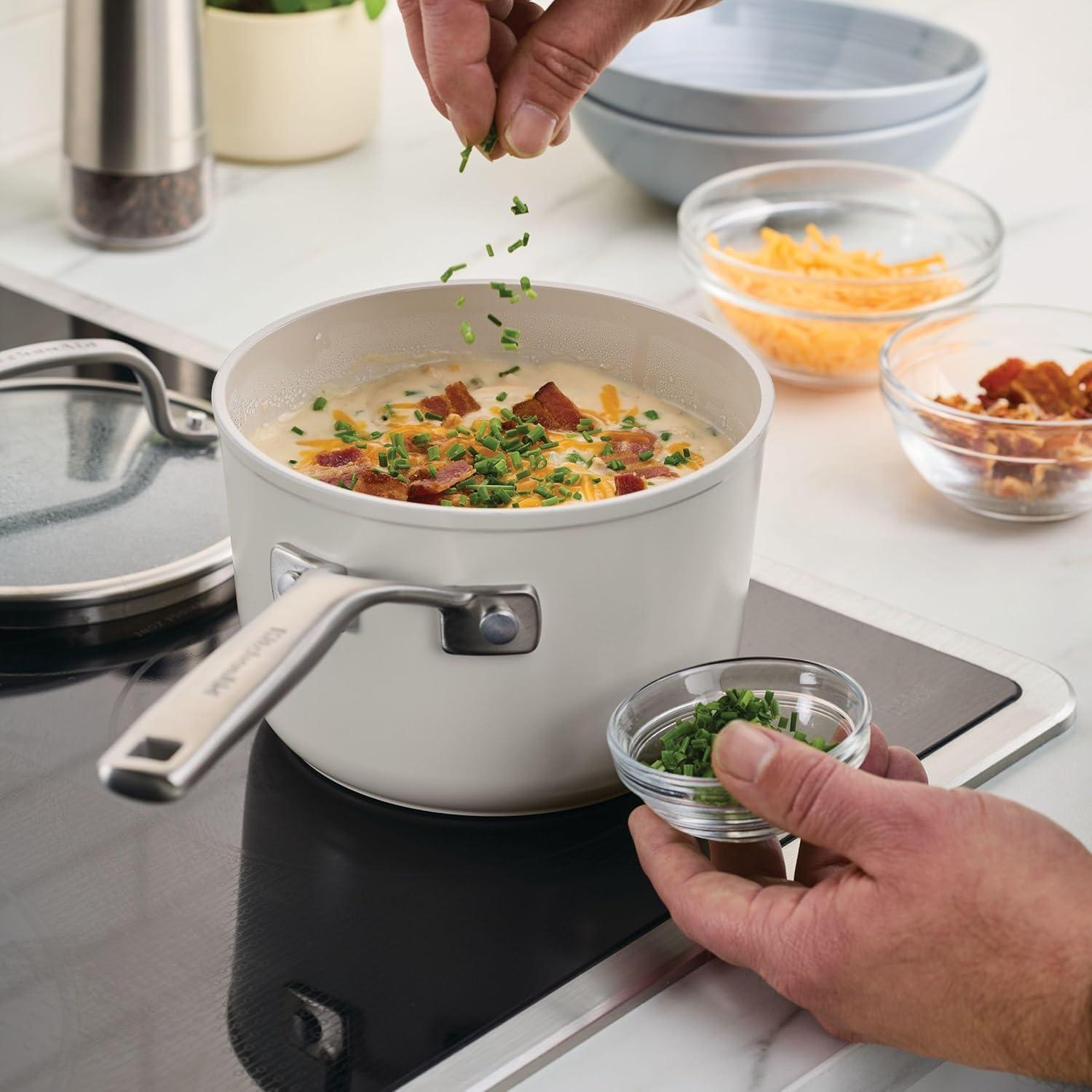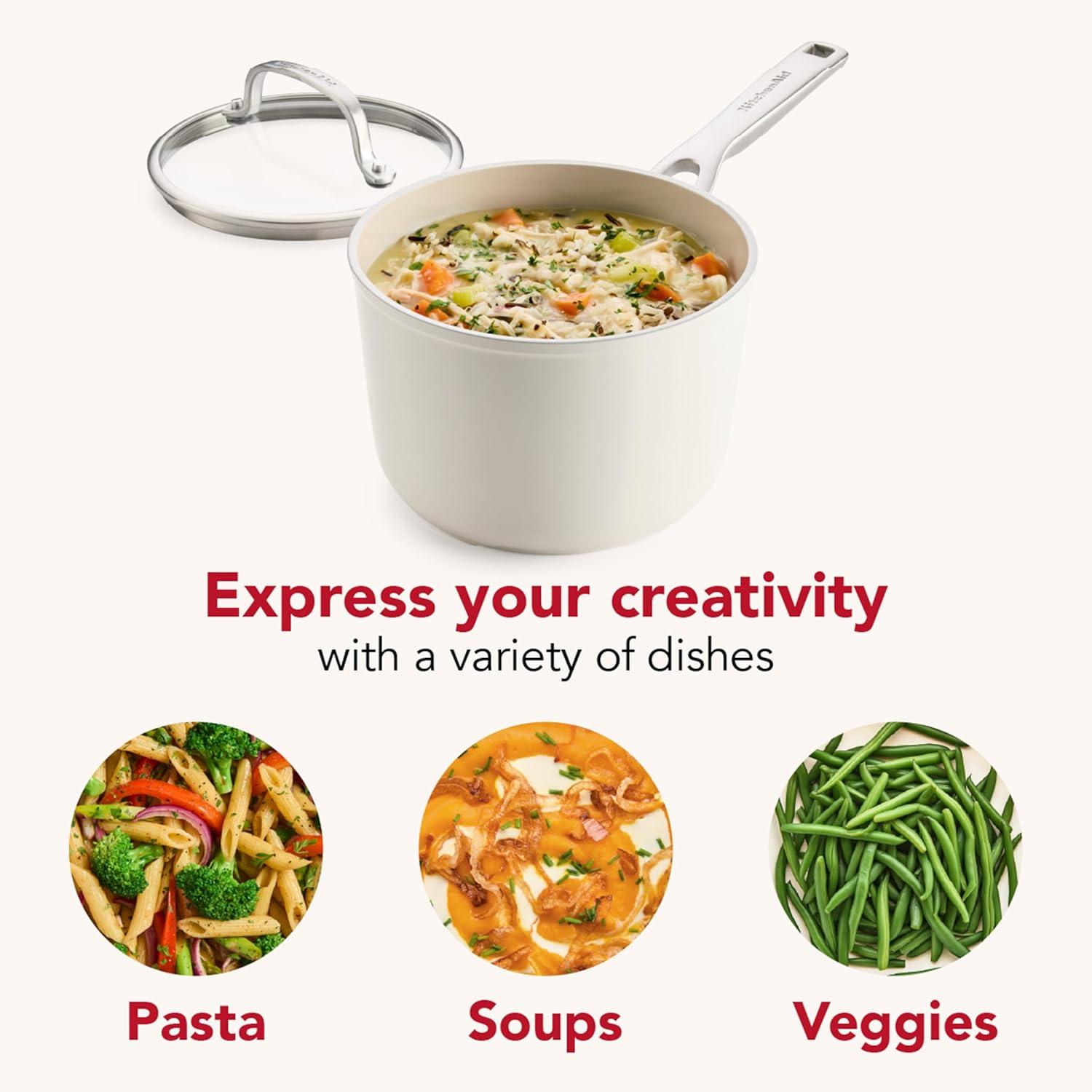 Elevate everyday cooking with the KitchenAid Hard-Anodized Ceramic Induction 2-Quart Saucepan with Lid, where contemporary style meets incredible nonstick performance—made without PFAS*. Cook healthier with durable ceramic nonstick, which is designed to release foods easily, requiring less oil to keep food from sticking. This saucepan is 8x stronger than standard aluminum, ensuring exceptional durability and heat conduction. Induction-ready performance, shatter-resistant glass lid, and double-riveted stainless steel handle add convenience, confidence, and control. Designed for effortless stovetop creativity and beautiful kitchen-to-table presentations, this versatile saucepan is here to help you transform meals into authentic moments of connection and inspiration. Oven safe up to 500 degrees F (lid to 350) and dishwasher safe for easy cleanup. *Product design does not involve intentionally adding to the cooking surface any of these substances which may otherwise be present in the environment.