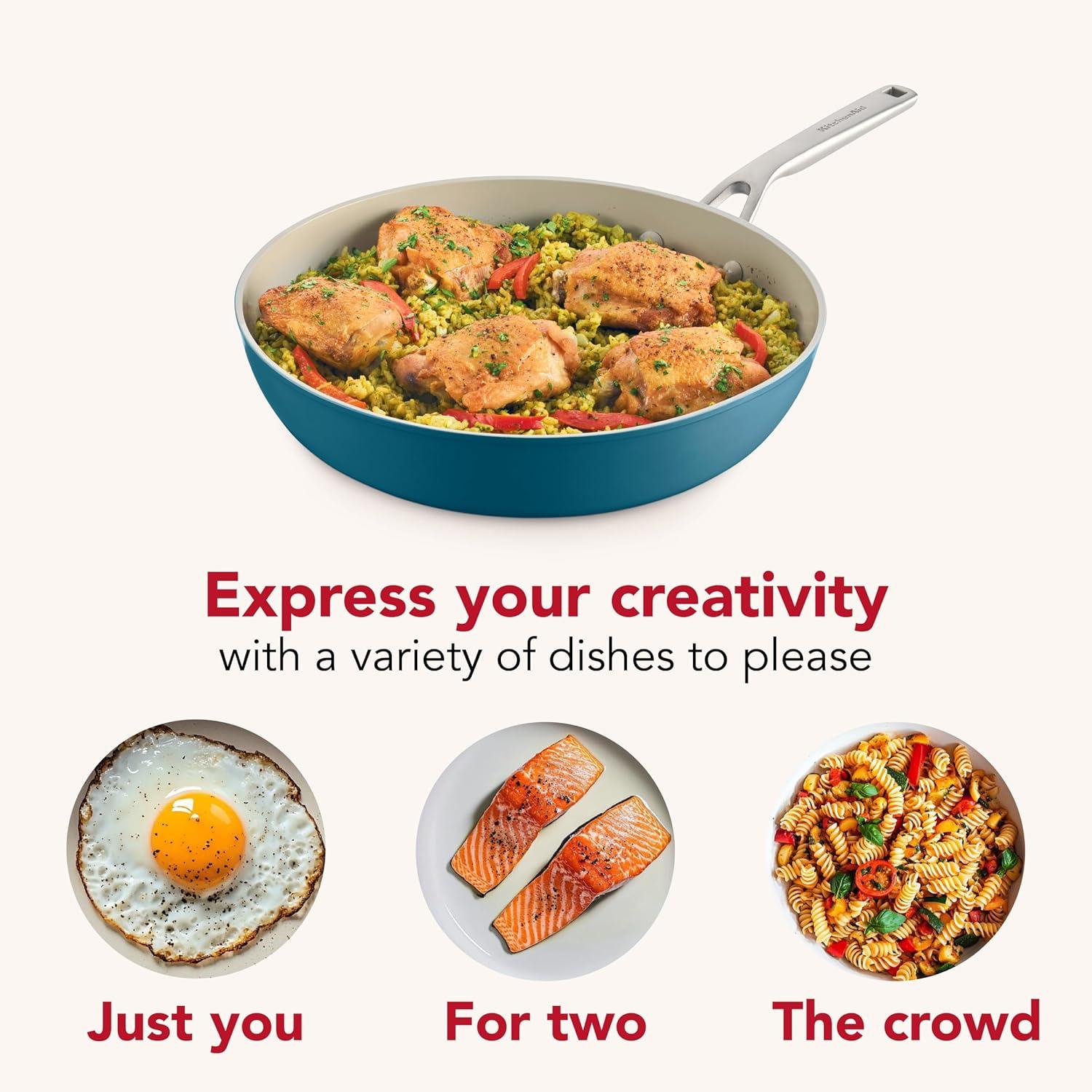 Made for everyday cooking and beautiful kitchen-to-table presentations, KitchenAid Hard Anodized Ceramic Cookware is finished with an easy-clean, ceramic nonstick interior and a durable hard-anodized exterior, crafted with thick, forged aluminum bases and rims to deliver excellent heat conduction and durability. This 10-piece set of kitchen pots and pans is 8x harder than aluminum for lasting performance and includes two frying pans, two saucepans, a versatile sauté pan, and a deep stockpot. Bring standout recipes to life in stylish cookware finished in trend-right colors to suit the contemporary kitchen. Practical features designed for convenience and control include shatter resistant, tempered glass lids and double-riveted stainless steel handles. The long-lasting ceramic nonstick means you'll need less oil (for healthier cooking) and enjoy fast and easy cleanup of sticky and saucy recipes. Oven safe to 500ºF (glass lids to 350ºF), this performance-worthy and presentation-ready cookware set will have your kitchen equipped to make the most of any meal.