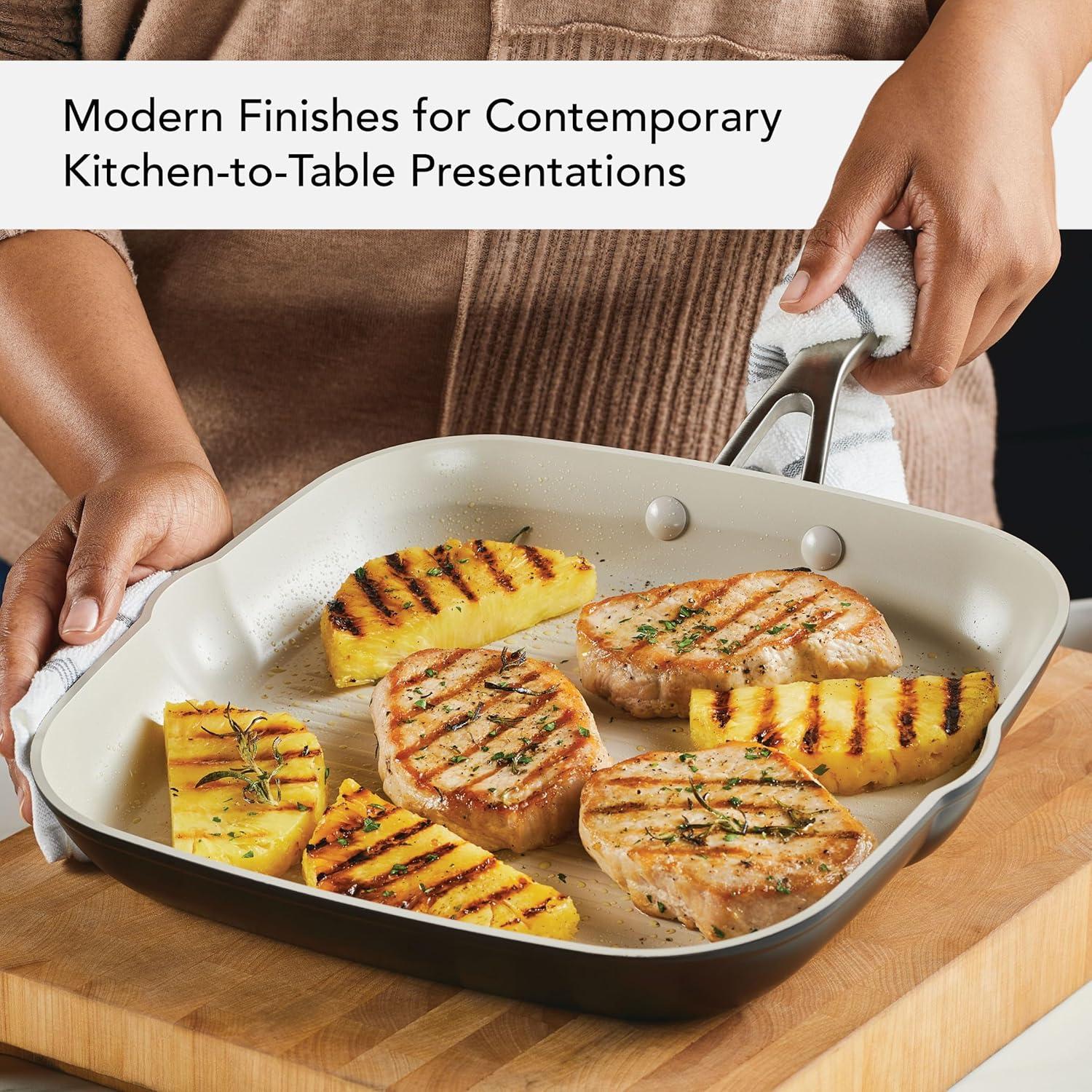 Made for everyday cooking and beautiful kitchen-to-table presentations, KitchenAid Hard Anodized Ceramic Cookware is finished with an easy-clean, ceramic nonstick interior and a durable hard-anodized exterior, crafted with thick, forged aluminum bases and rims to deliver excellent heat conduction and durability. This versatile 11.25-inch grill pan is 8x harder than aluminum for lasting performance and features a long-lasting ceramic nonstick, so you'll need less oil (for healthier cooking) but still get fast and easy cleanup of sticky recipes. Oven safe to 500ºF, this ceramic grill pan is finished in trend-right color to suit the contemporary kitchen, features a double-riveted handle for control from stove to oven to table, and will have your kitchen equipped to make the most of any meal.