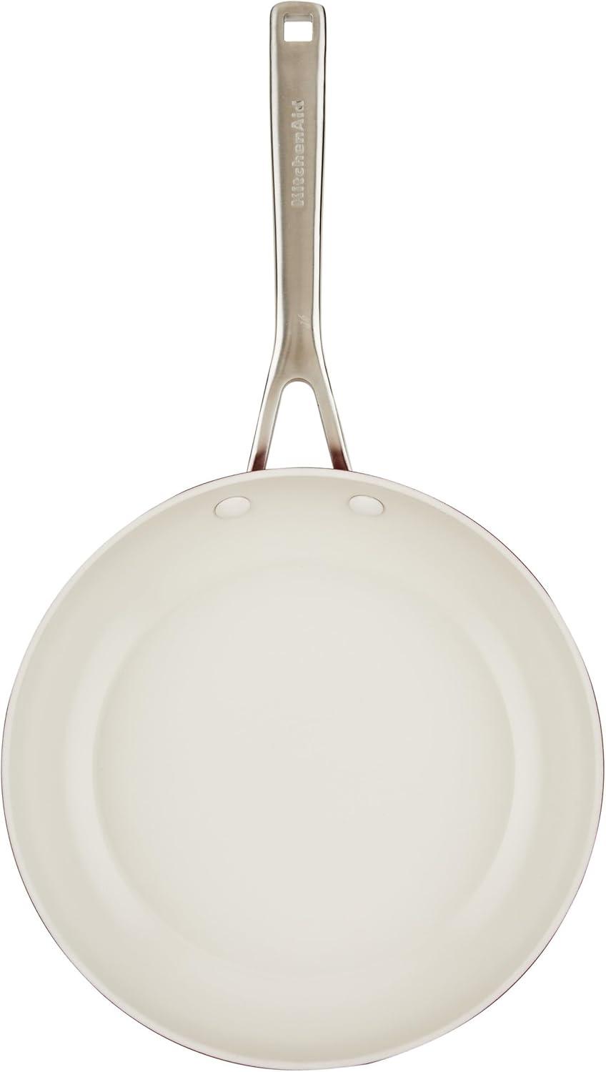 Made for everyday cooking and beautiful kitchen-to-table presentations, KitchenAid Hard Anodized Ceramic Cookware is finished with an easy-clean, ceramic nonstick interior and a durable hard-anodized exterior, crafted with thick, forged aluminum bases and rims to deliver excellent heat conduction and durability. This 10-piece set of kitchen pots and pans is 8x harder than aluminum for lasting performance and includes two frying pans, two saucepans, a versatile sauté pan, and a deep stockpot. Bring standout recipes to life in stylish cookware finished in trend-right colors to suit the contemporary kitchen. Practical features designed for convenience and control include shatter resistant, tempered glass lids and double-riveted stainless steel handles. The long-lasting ceramic nonstick means you'll need less oil (for healthier cooking) and enjoy fast and easy cleanup of sticky and saucy recipes. Oven safe to 500ºF (glass lids to 350ºF), this performance-worthy and presentation-ready cookware set will have your kitchen equipped to make the most of any meal.