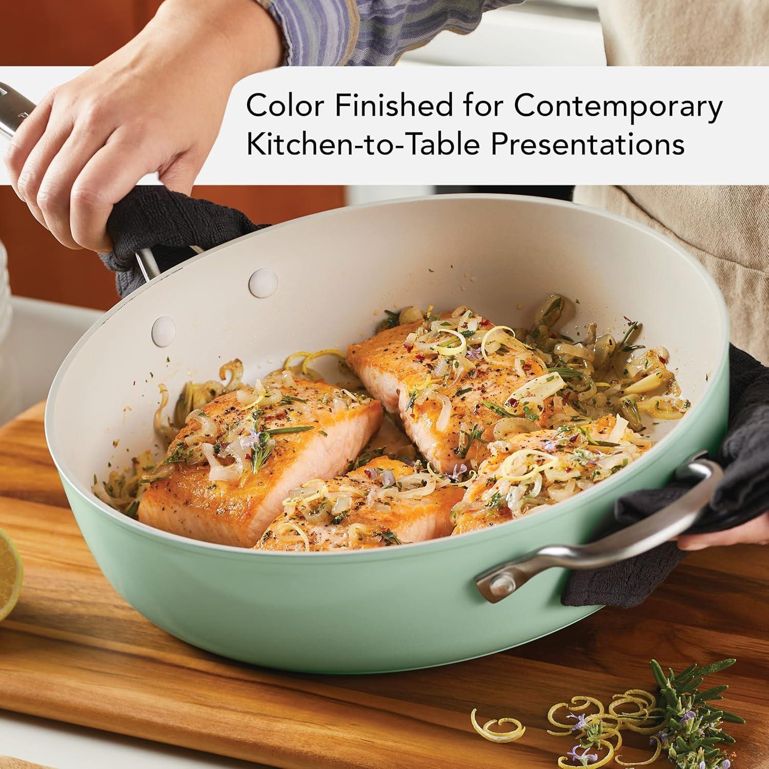 KITCHEN TO TABLE DESIGN: Large nonstick sauté pan is ideal for big one-pan recipes and is color-finished in a modern Pistachio hue for a standout, contemporary look from performance to presentation