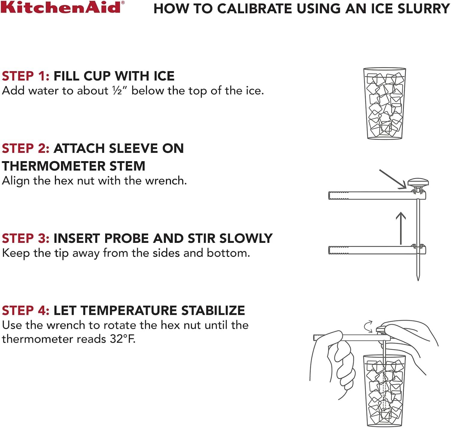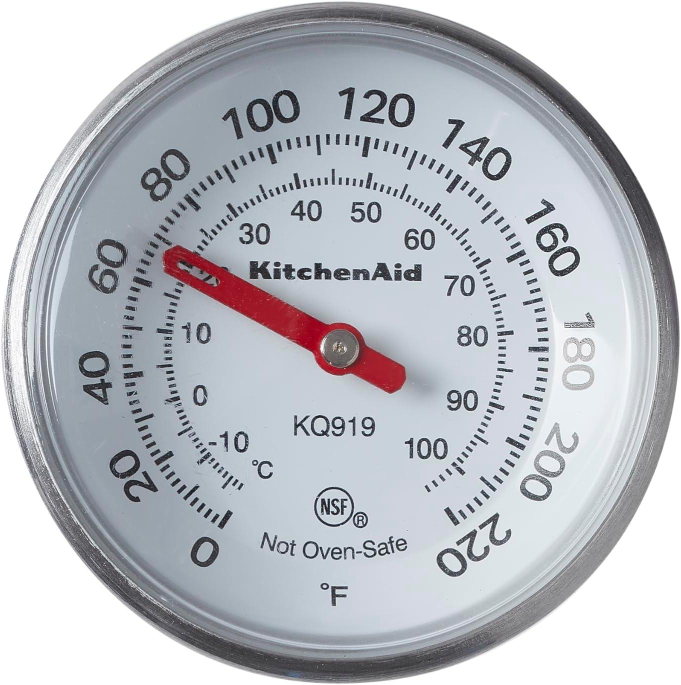 This KitchenAid large-dial instant-read analog thermometer is an excellent addition to any kitchen tool repertoire. Measuring temperatures in both Fahrenheit and Celcius is great for global regions. The sturdiness of the shatterproof plastic lens and the thermometer's ability to withstand drops to the floor make it a long-term solution to any cooking or baking needs. This product also has a protective pocket sleeve with a Recalibration wrench and can be used as a handle for the thermometer. NSF listed. Helpful hints: This thermometer is not meant to be left in food during cooking. The plastic lens could be damaged by excessive heat. Important: The thermometer will be hot after use. Use potholders or oven mitts when handling hot thermometers.