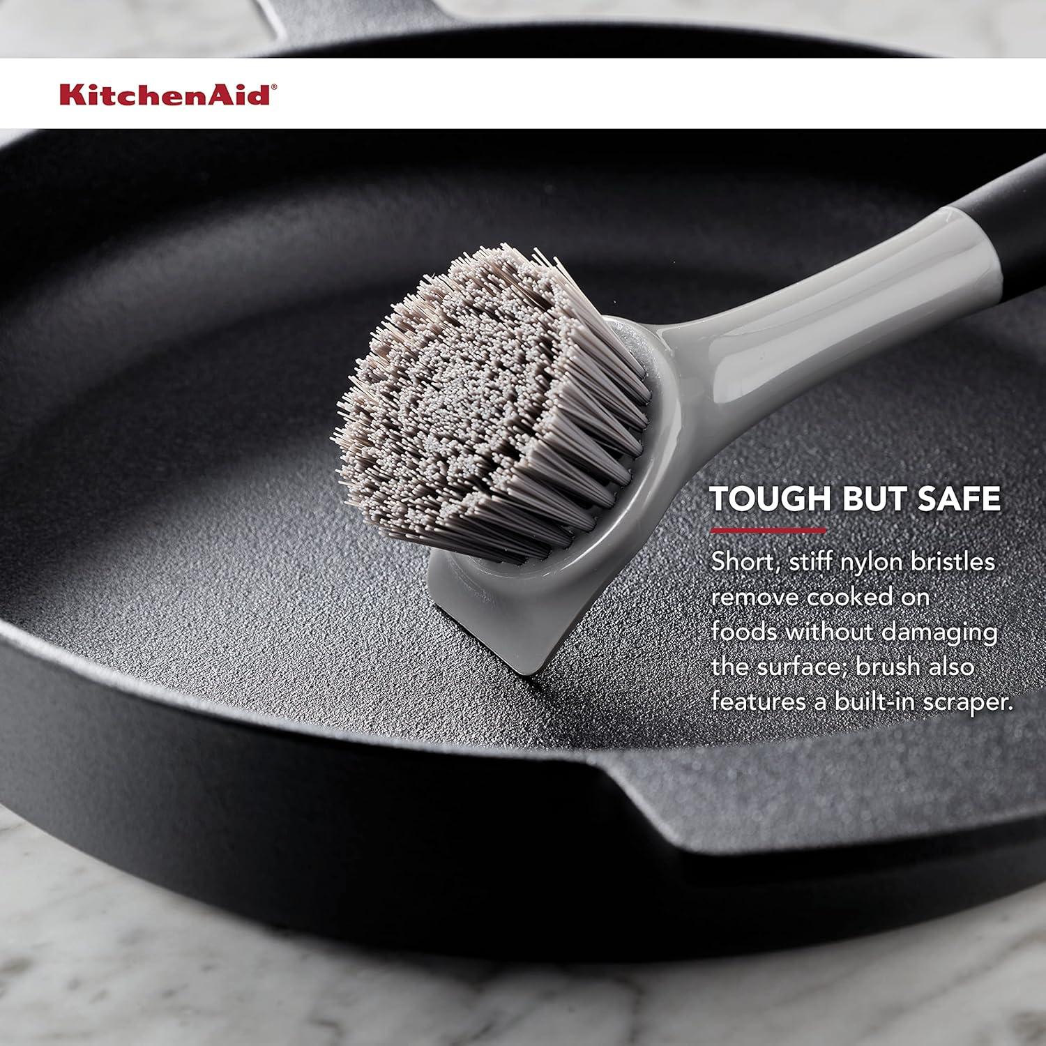 The KitchenAid Palm Brush With Dish makes hand-washing dishware, cookware, flatware, and glassware a quick, effortless task. This convenient brush fits securely in the palm of your hand to provide maximum control while cleaning dishes. The storage dish keeps the brush neatly stored and easily accessible by the sink, catching the excess water that drips from the brush to keep countertops dry. The strong nylon bristles stand up to tough scrubbing and gently remove food without scratching surfaces, while the soft, nonslip handle provides a secure grip even when wet, keeping the brush from slipping out of your hand while washing. Dishwasher safe.