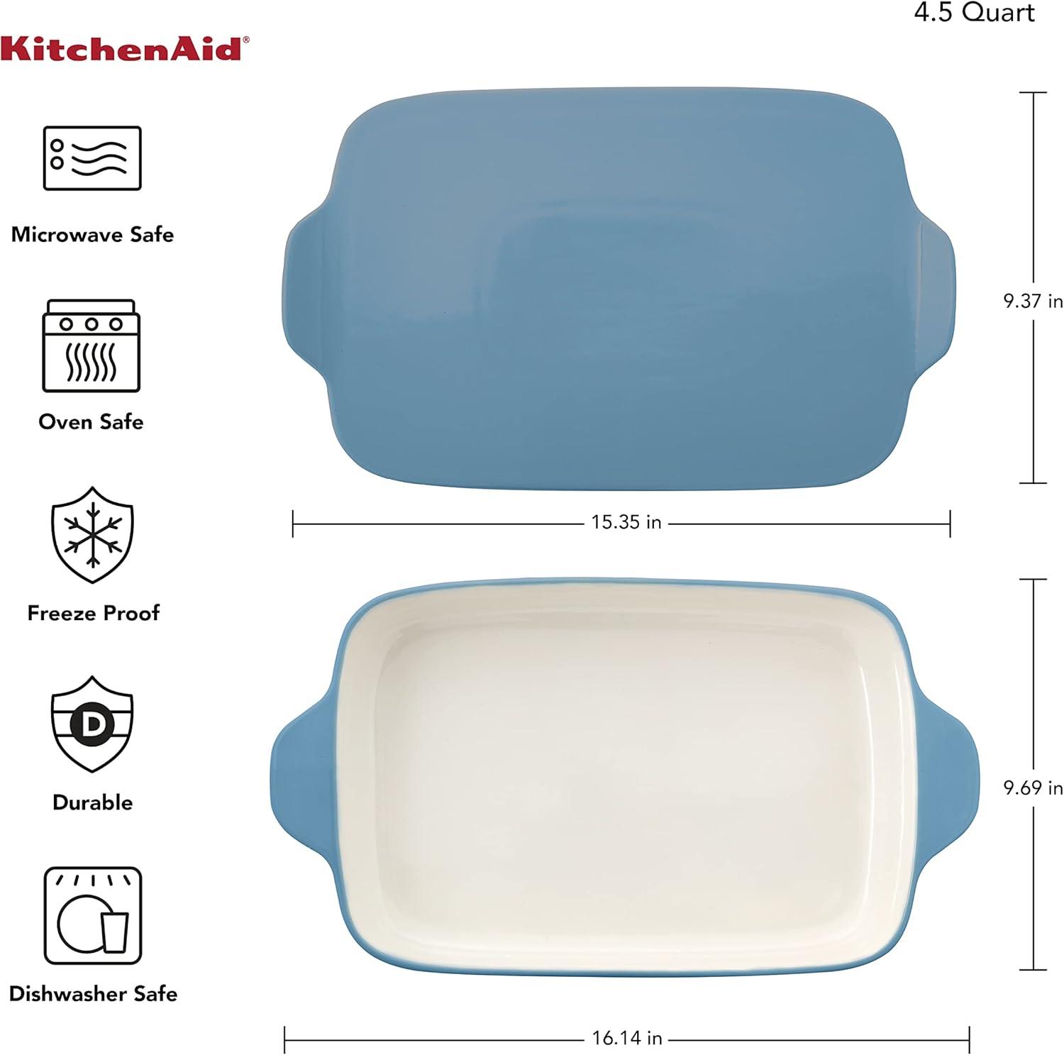 This KitchenAid Rectangular Baker with Lid is a kitchen essential. Use to make casseroles for family meals. Made from highly durable stoneware, the vitrified construction offers chip and stain resistance. Expect professional results when using this nonporous bakeware, which provides even heat distribution and retention. This versatile, beautiful piece is ideal for both baking, serving, and is safe for oven, freezer, microwave, and dishwasher. Also, the lid can be used as a trivet when cooled and clean. 4.5 quart capacity. Measures 9 x 13 x 2.5 inch (inner); 9.69 x 16.14 x 2.5 inch (outer); 9.37 x 15.35 x 0.95 inch (lid). Lifetime Limited Warranty.