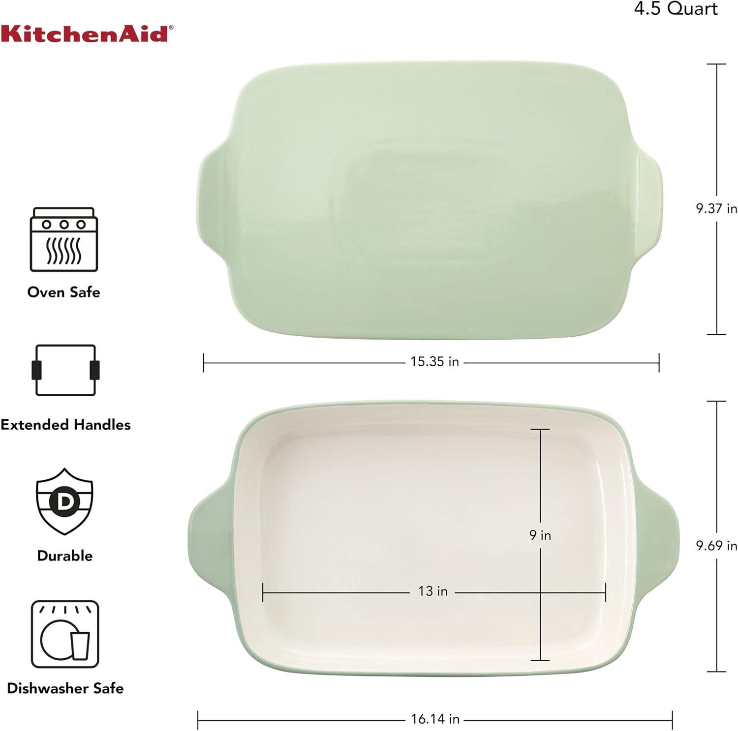 This KitchenAid Rectangular Baker with Lid is a kitchen essential. Use to make casseroles for family meals. Made from highly durable stoneware, the vitrified construction offers chip and stain resistance. Expect professional results when using this nonporous bakeware, which provides even heat distribution and retention. This versatile, beautiful piece is ideal for both baking, serving, and is safe for oven, freezer, microwave, and dishwasher. Also, the lid can be used as a trivet when cooled and clean. 4.5 quart capacity. Measures 9 x 13 x 2.5 inch (inner); 9.69 x 16.14 x 2.5 inch (outer); 9.37 x 15.35 x 0.95 inch (lid). Lifetime Limited Warranty.