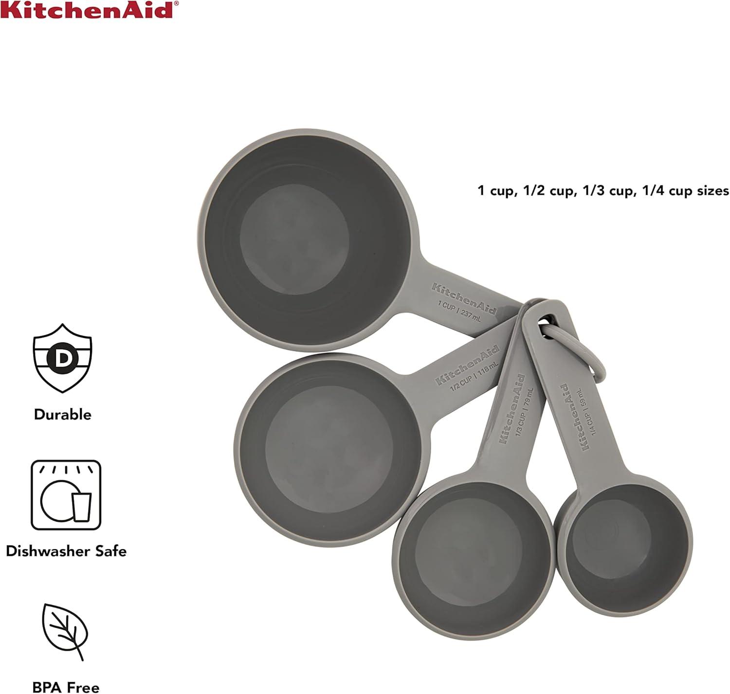 This KitchenAid Measuring Cup Set includes 4 different sizes: 1/4 cup (59mL), 1/3 cup (79mL), 1/2 cup (118mL), and 1 cup (237mL). Crafted from durable, BPA-free plastic, each features its size in easy to read letters in both metric and imperial units. Soft grips under the handles maximize comfort and control. Ideal for use with both wet and dry ingredients and designed to nest, with a thick plastic ring to secure them together for easy organization and storage. Dishwasher safe, top rack recommended, for quick and easy clean up.